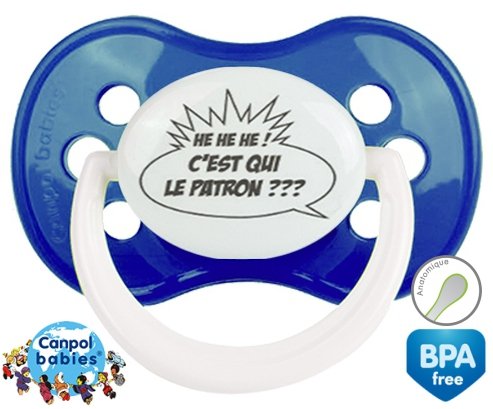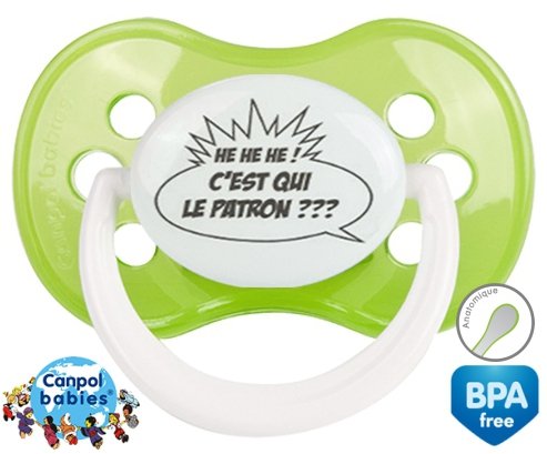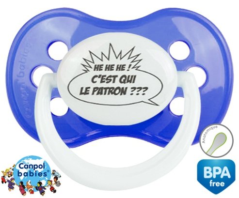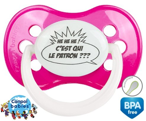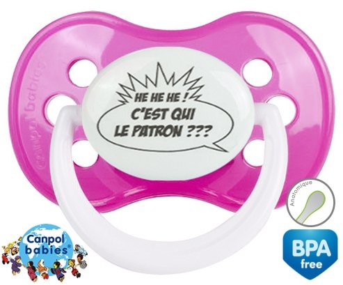 Sucette personnalisée pour bébé C'est qui le patron? à embout Anatomique en silicone de la marque Canpol Babies avec impression en en Gris de la collection Humour 4 Saisons.La silicone se reconnaît par sa couleur transparente. C'est une matière souple, douce, sans goût ni odeur et offre à bébé une succion plus facile grâce à sa souplesse.