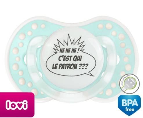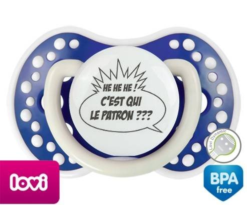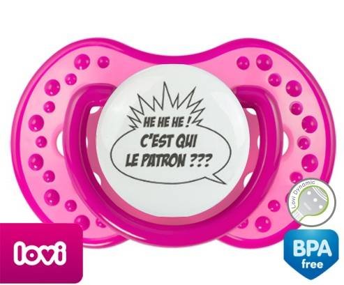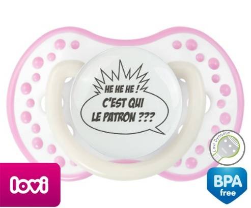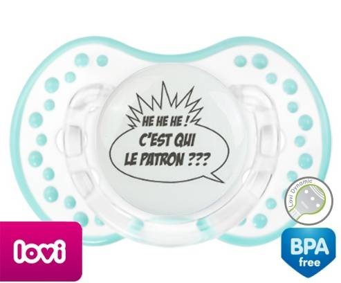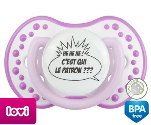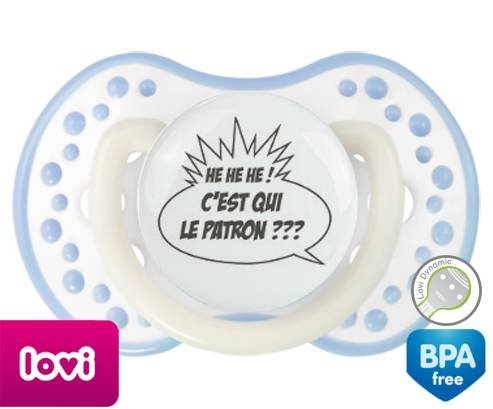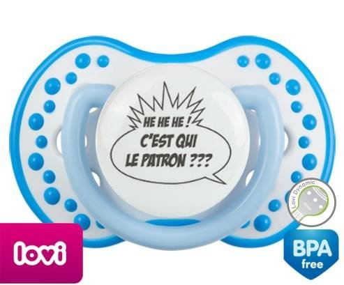 Tétine personnalisée pour bébé C'est qui le patron? à embout LOVI Dynamic en silicone de la marque Lovi Dynamic avec impression en en Gris de la collection Humour 4 Saisons.La silicone se reconnaît par sa couleur transparente. C'est une matière souple, douce, sans goût ni odeur et offre à bébé une succion plus facile grâce à sa souplesse.