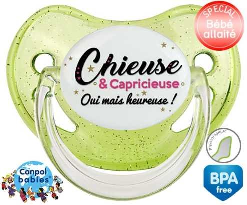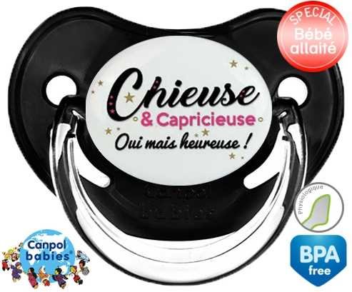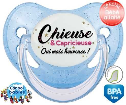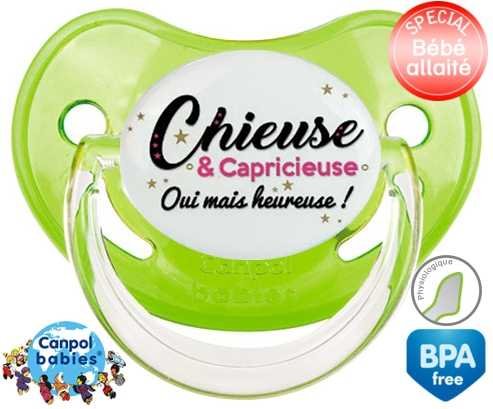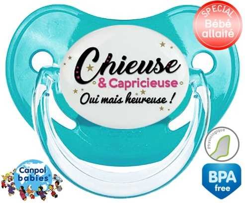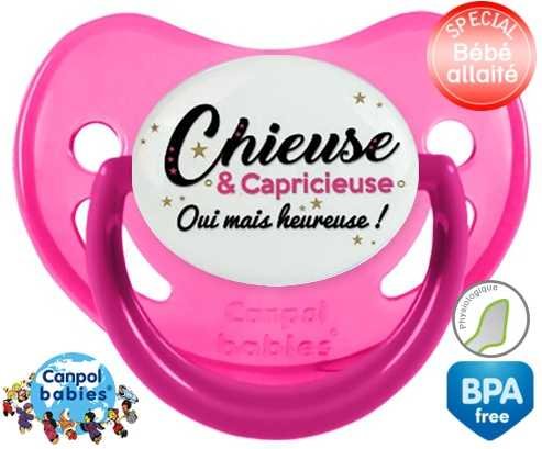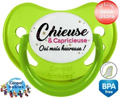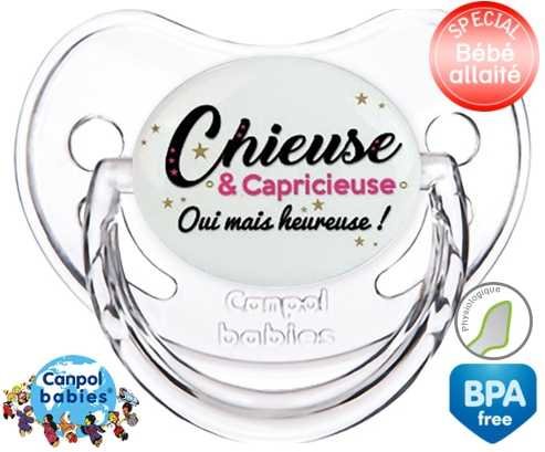 Tetine personnalisee pour bébé Chieuse et capricieuse mais heureuse! à embout Physiologique en silicone de la marque Canpol Babies avec impression en en Couleurs de la collection Message.La silicone se reconnaît par sa couleur transparente. C'est une matière souple, douce, sans goût ni odeur et offre à bébé une succion plus facile grâce à sa souplesse.