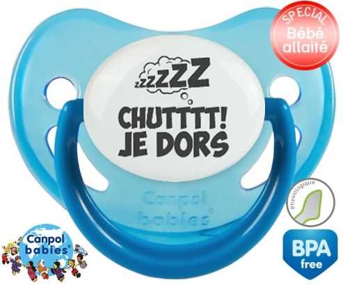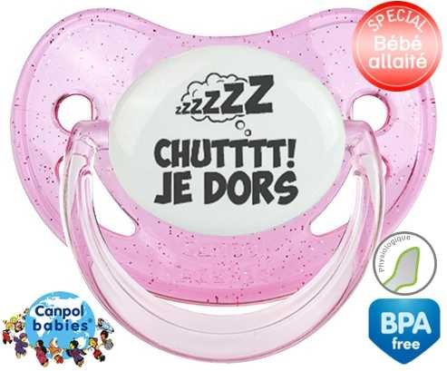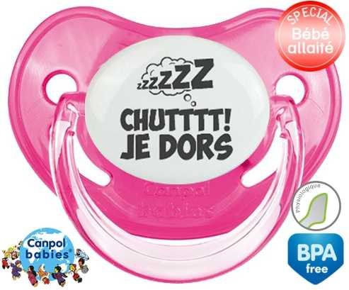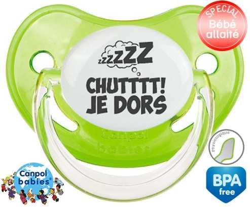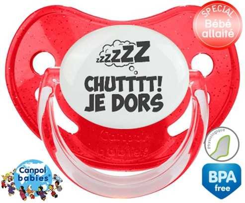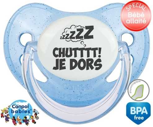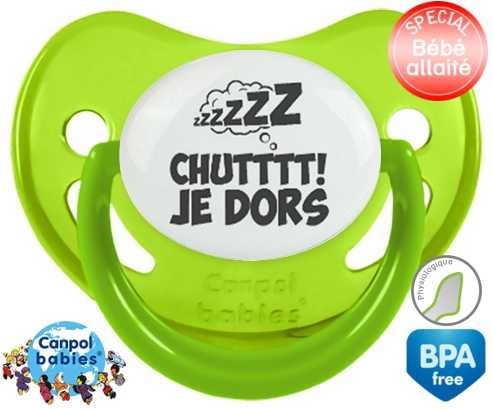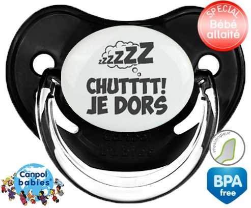 Tetine personnalisee pour bébé Chut je dors : Embout Physiologique en silicone de la marque Canpol Babies avec impression en gris.
