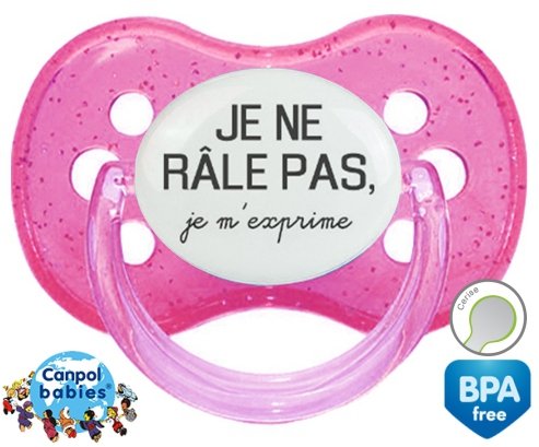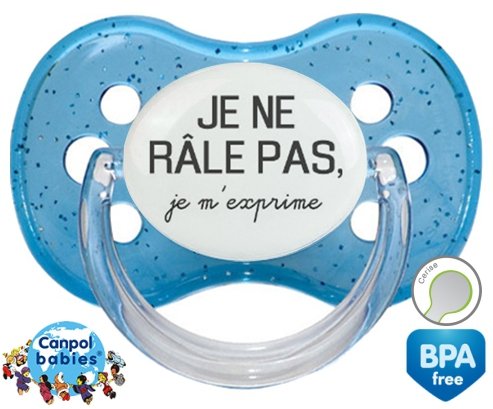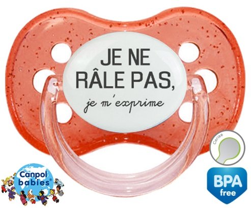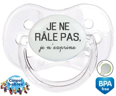 Tétine personnalisée pour bébé Je ne râle pas je m'exprime style1 à embout Cerise en silicone de la marque Canpol Babies avec impression en en Gris de la collection Humour 4 Saisons.La silicone se reconnaît par sa couleur transparente. C'est une matière souple, douce, sans goût ni odeur et offre à bébé une succion plus facile grâce à sa souplesse.