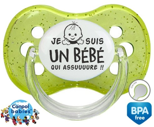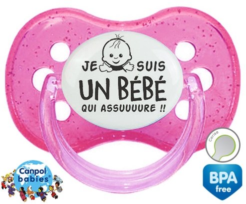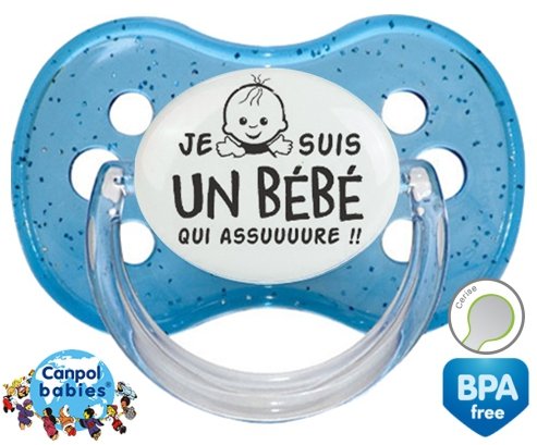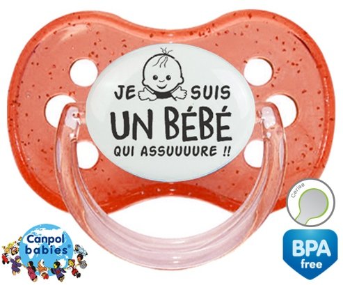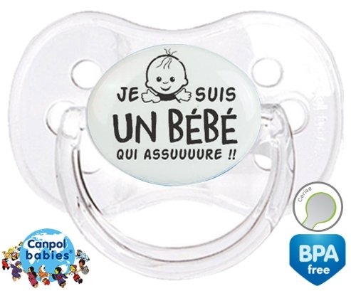 Tetine personnalisee pour bébé Je suis un bébé qui assuuure !! à embout Cerise en silicone de la marque Canpol Babies avec impression en en Gris de la collection Humour 4 Saisons.La silicone se reconnaît par sa couleur transparente. C'est une matière souple, douce, sans goût ni odeur et offre à bébé une succion plus facile grâce à sa souplesse.