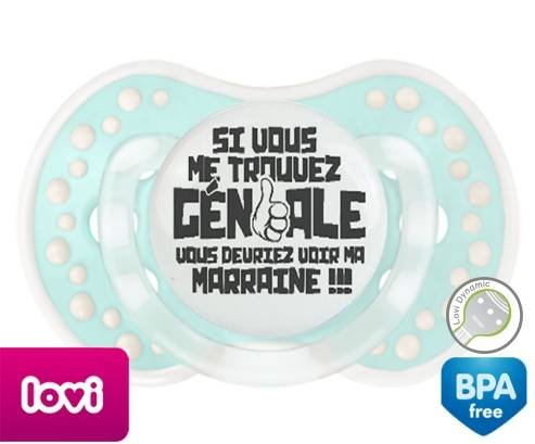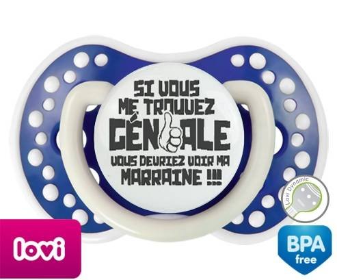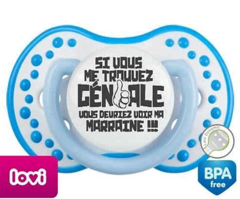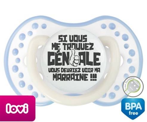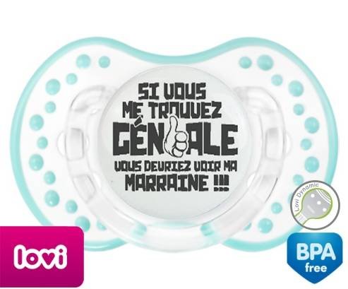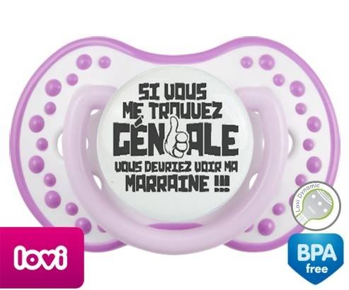 Tetine personnalisee pour bébé Si vous me trouvez géniale à embout LOVI Dynamic en silicone de la marque Lovi Dynamic avec impression en en Gris de la collection Humour 4 Saisons.La silicone se reconnaît par sa couleur transparente. C'est une matière souple, douce, sans goût ni odeur et offre à bébé une succion plus facile grâce à sa souplesse.