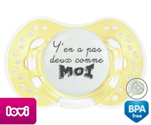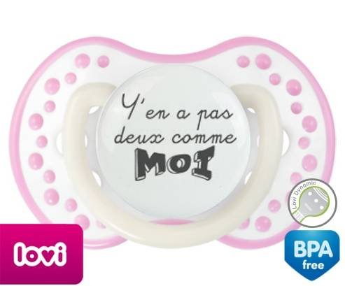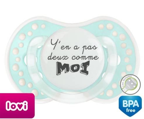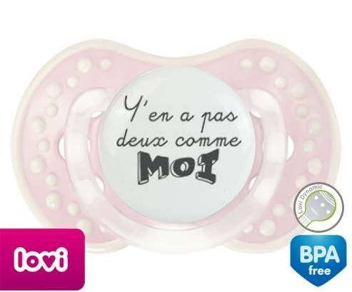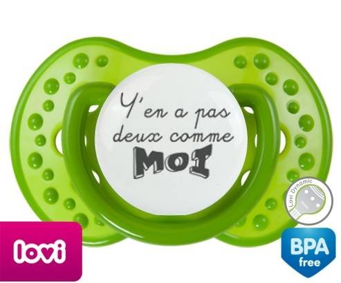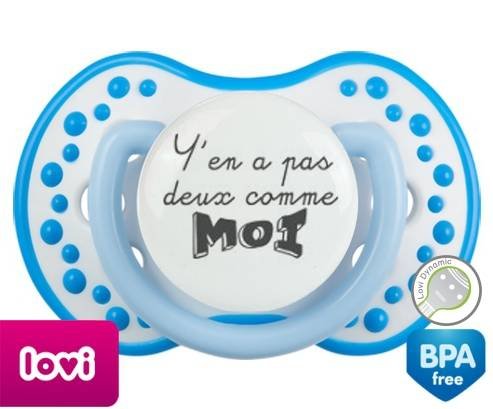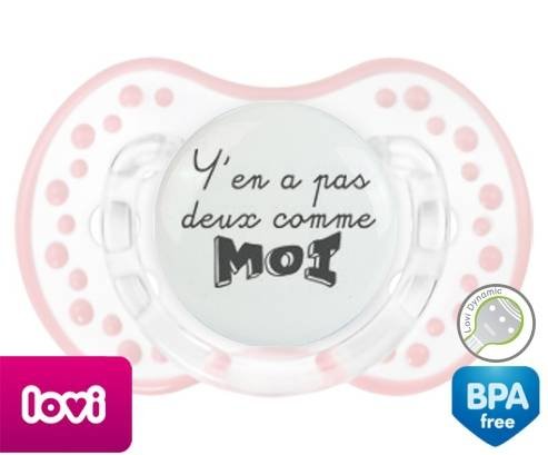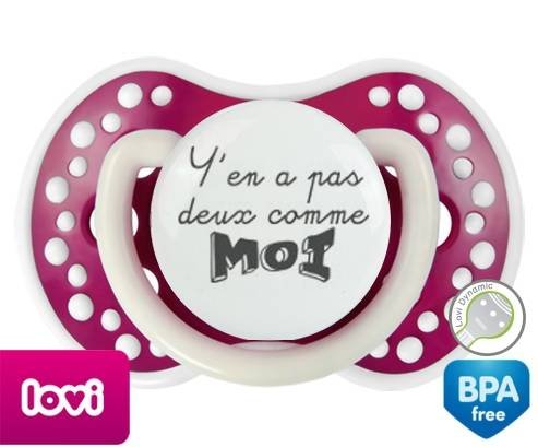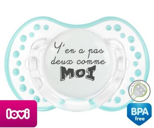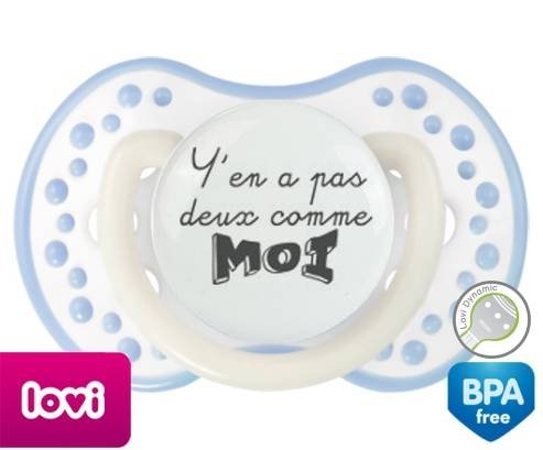 Tétine personnalisée pour bébé Y'en a pas deux comme moi à embout LOVI Dynamic en silicone de la marque Lovi Dynamic avec impression en en Gris de la collection Message.La silicone se reconnaît par sa couleur transparente. C'est une matière souple, douce, sans goût ni odeur et offre à bébé une succion plus facile grâce à sa souplesse.