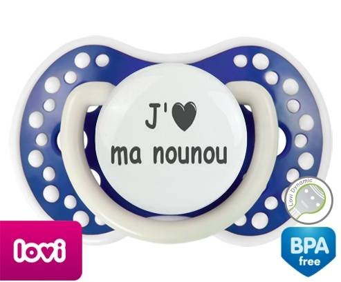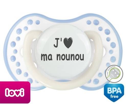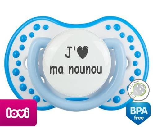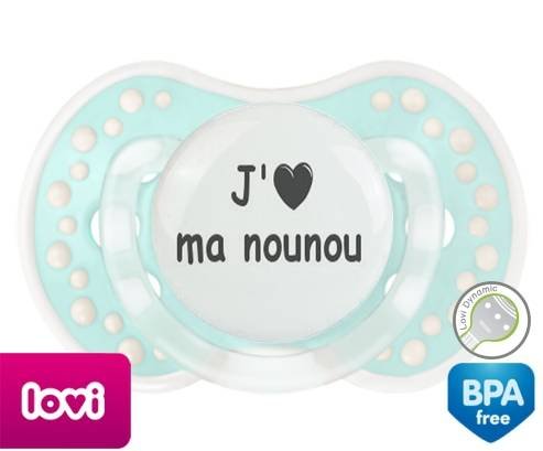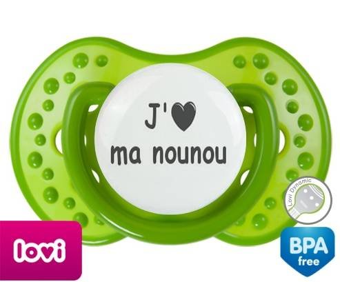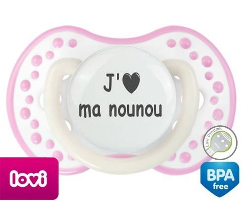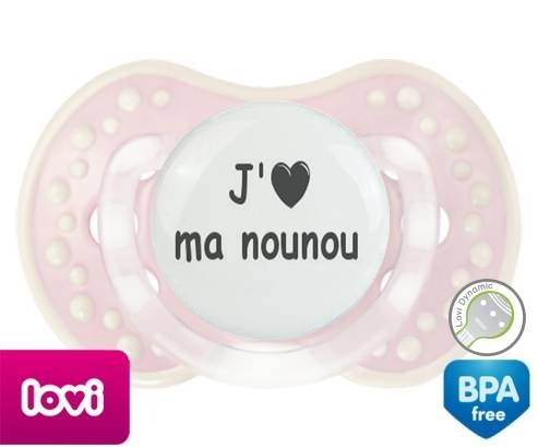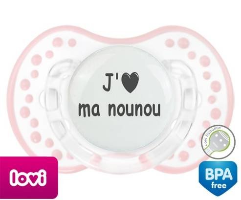 Tetine personnalisee pour bébé Coeur j'aime ma nounou à embout LOVI Dynamic en silicone de la marque Lovi Dynamic avec impression en en Gris de la collection j'aime / j'adore.La silicone se reconnaît par sa couleur transparente. C'est une matière souple, douce, sans goût ni odeur et offre à bébé une succion plus facile grâce à sa souplesse.