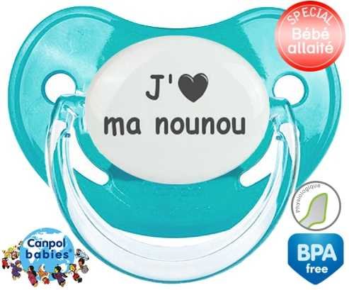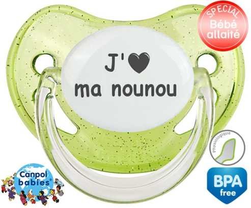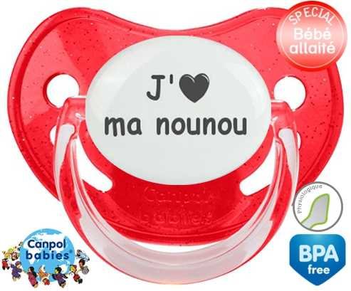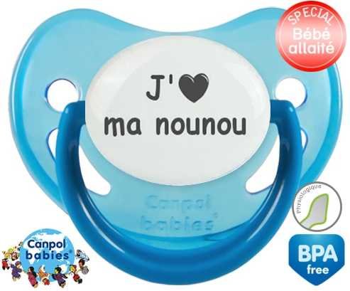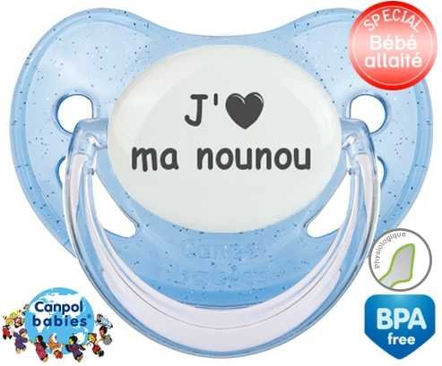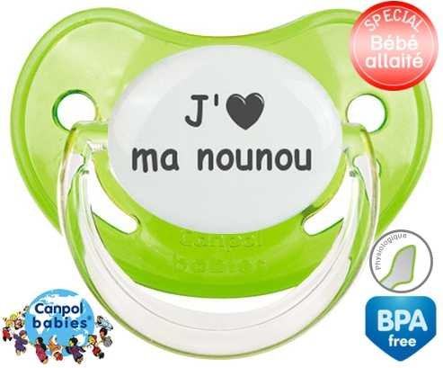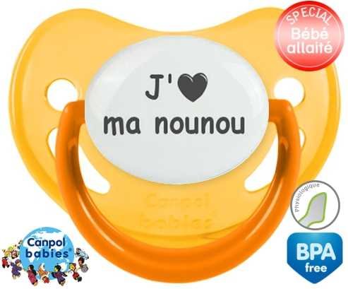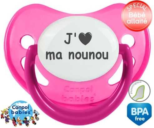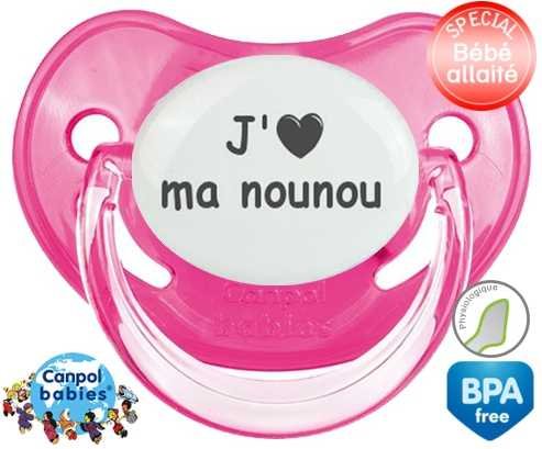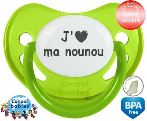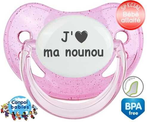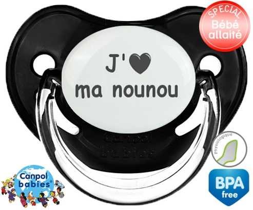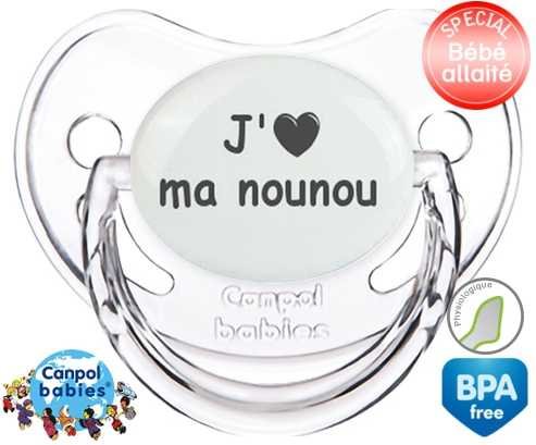 Sucette personnalisée pour bébé Coeur j'aime ma nounou à embout Physiologique en silicone de la marque Canpol Babies avec impression en en Gris de la collection j'aime / j'adore.La silicone se reconnaît par sa couleur transparente. C'est une matière souple, douce, sans goût ni odeur et offre à bébé une succion plus facile grâce à sa souplesse.