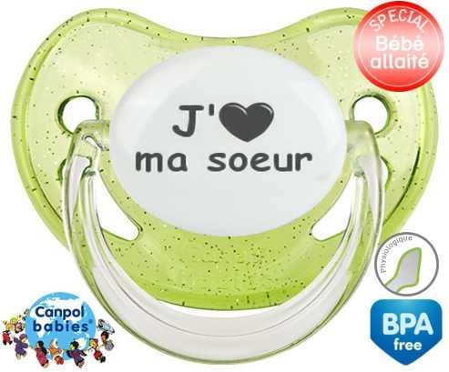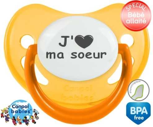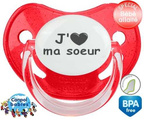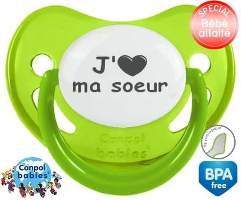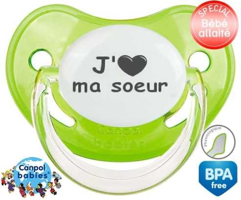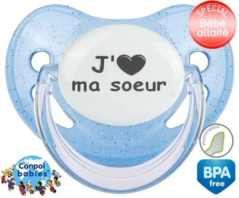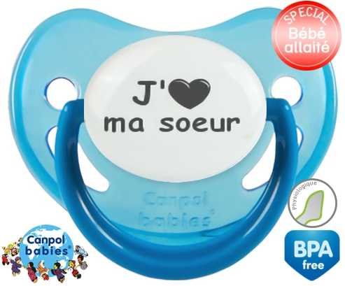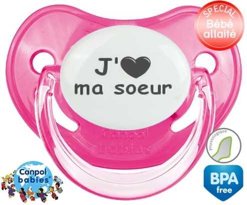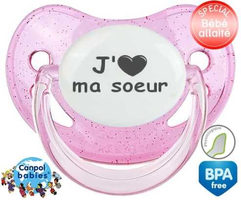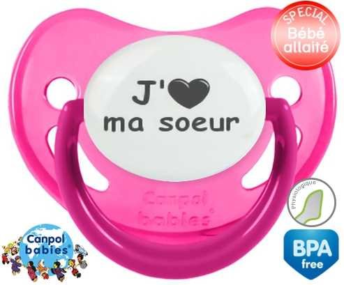 Sucette personnalisée pour bébé Coeur j'aime ma soeur à embout Physiologique en silicone de la marque Canpol Babies avec impression en en Gris de la collection j'aime / j'adore.La silicone se reconnaît par sa couleur transparente. C'est une matière souple, douce, sans goût ni odeur et offre à bébé une succion plus facile grâce à sa souplesse.