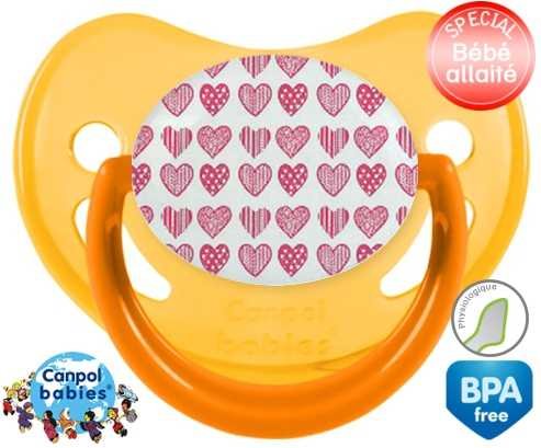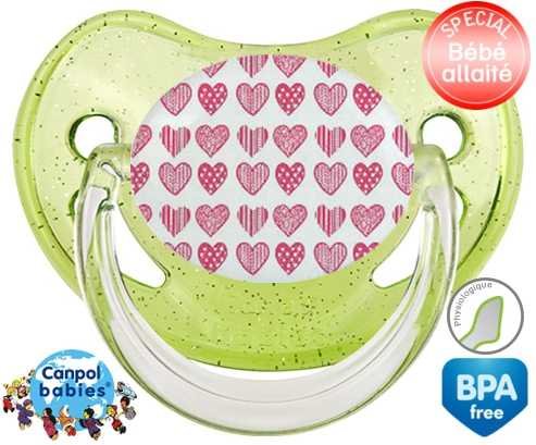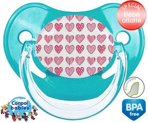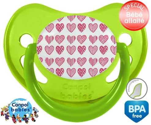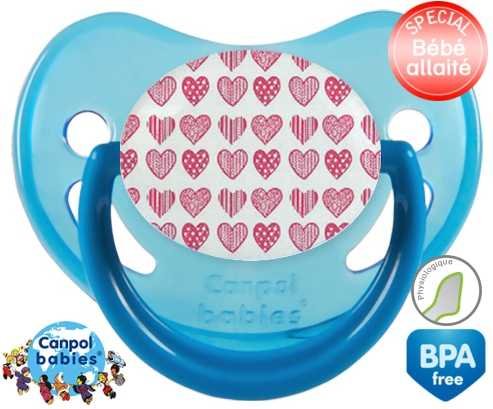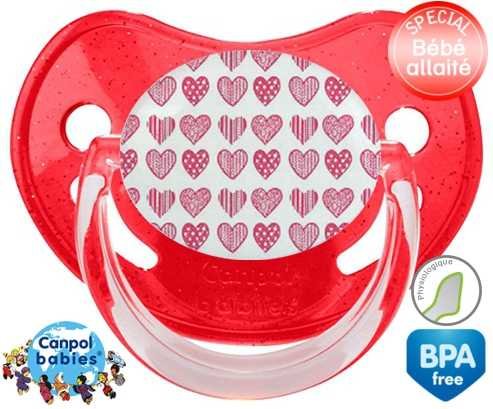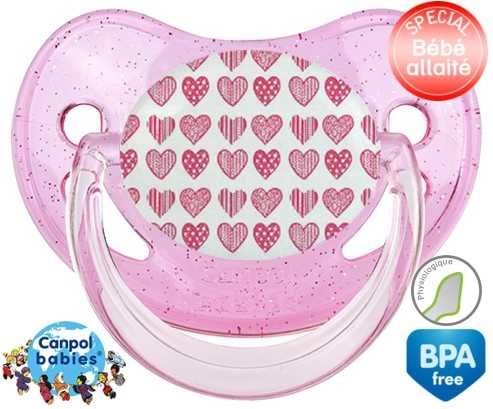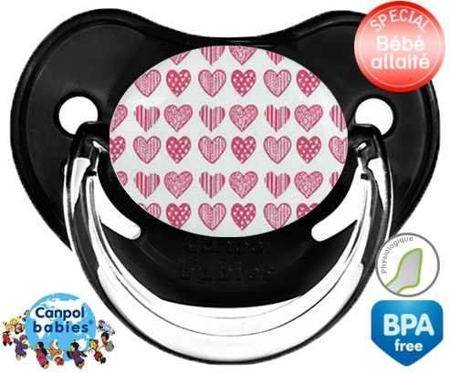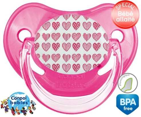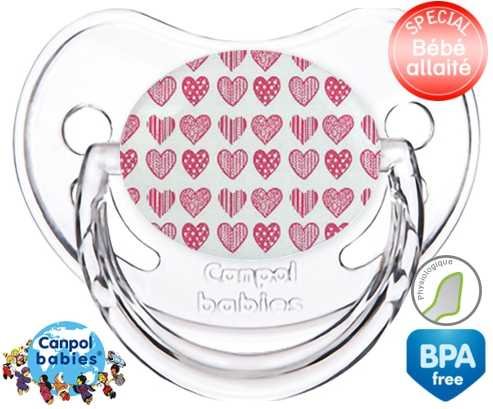 Sucette personnalisée pour bébé Coeurs roses à embout Physiologique en silicone de la marque Canpol Babies avec impression en en Couleurs de la collection Design / Motif.La silicone se reconnaît par sa couleur transparente. C'est une matière souple, douce, sans goût ni odeur et offre à bébé une succion plus facile grâce à sa souplesse.