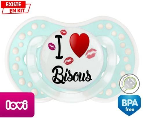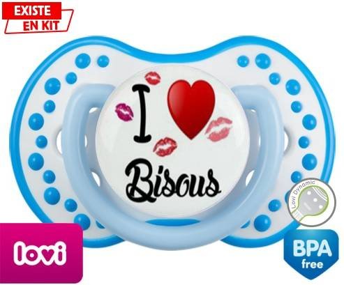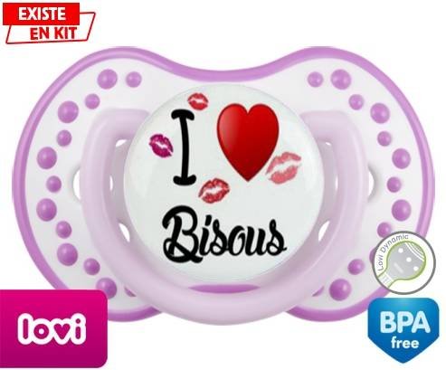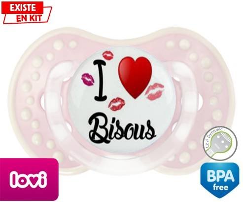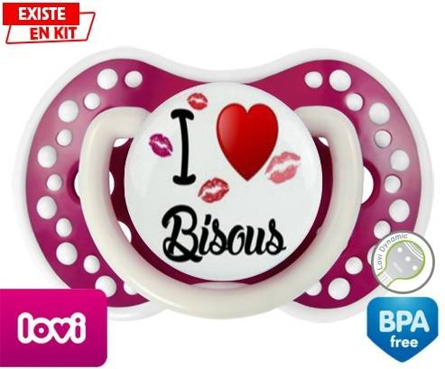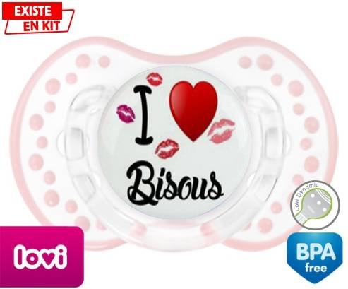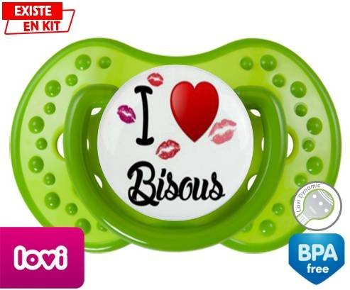 Tétine personnalisée pour bébé I love les bisous à embout LOVI Dynamic en silicone de la marque Lovi Dynamic avec impression en en Couleurs de la collection I love / I like.La silicone se reconnaît par sa couleur transparente. C'est une matière souple, douce, sans goût ni odeur et offre à bébé une succion plus facile grâce à sa souplesse.