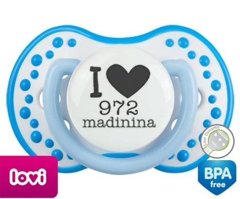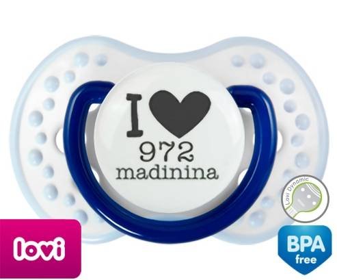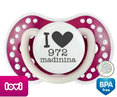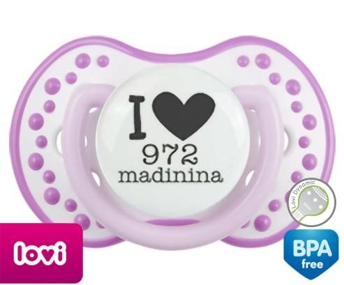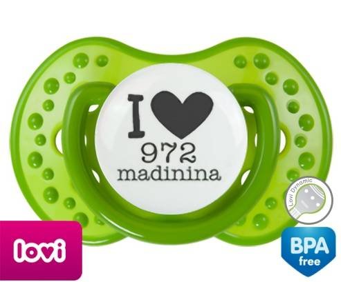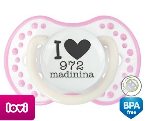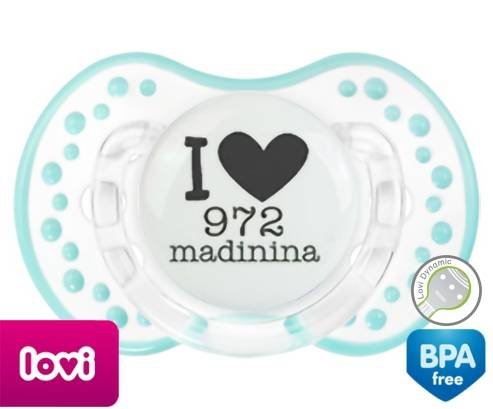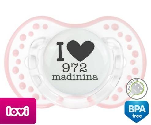 Sucette personnalisée pour bébé I love madinina à embout LOVI Dynamic en silicone de la marque Lovi Dynamic avec impression en en Gris de la collection I love / I like.La silicone se reconnaît par sa couleur transparente. C'est une matière souple, douce, sans goût ni odeur et offre à bébé une succion plus facile grâce à sa souplesse.
