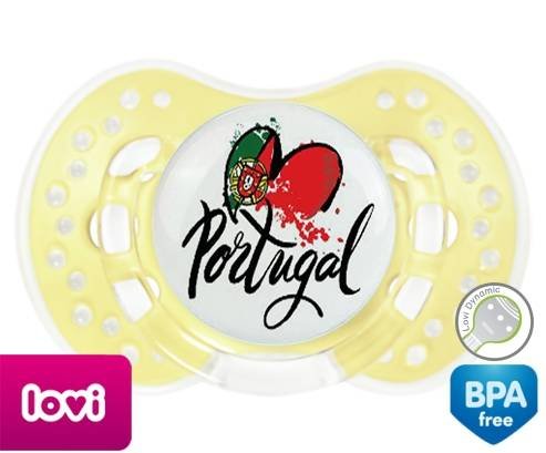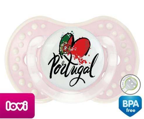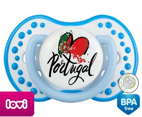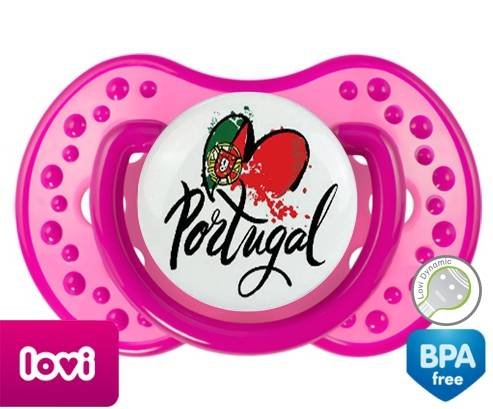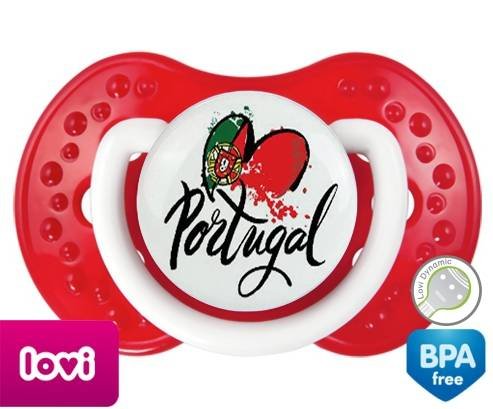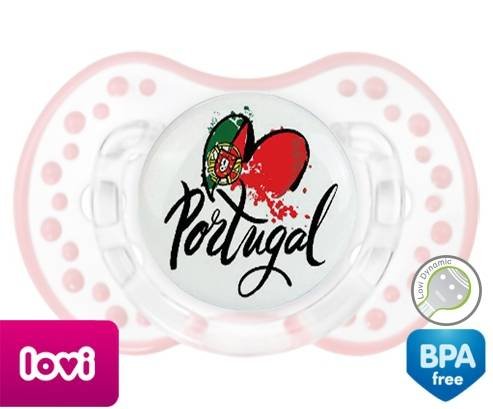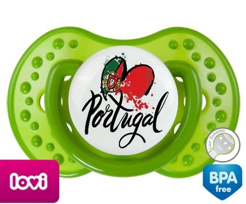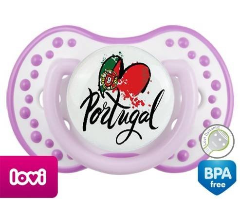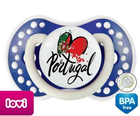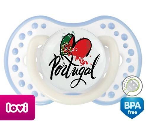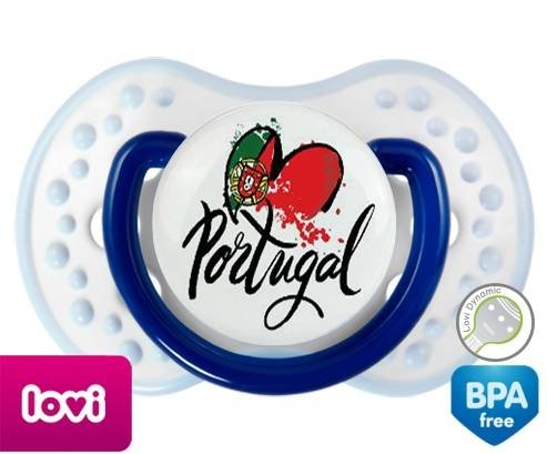 Tetine personnalisee pour bébé I love portugal coeur à embout LOVI Dynamic en silicone de la marque Lovi Dynamic avec impression en en Couleurs de la collection I love / I like.La silicone se reconnaît par sa couleur transparente. C'est une matière souple, douce, sans goût ni odeur et offre à bébé une succion plus facile grâce à sa souplesse.
