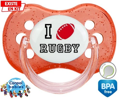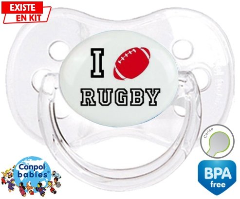 Sucette personnalisée pour bébé I love rugby style1 à embout Cerise en silicone de la marque Canpol Babies avec impression en en Couleurs de la collection I love / I like.La silicone se reconnaît par sa couleur transparente. C'est une matière souple, douce, sans goût ni odeur et offre à bébé une succion plus facile grâce à sa souplesse.