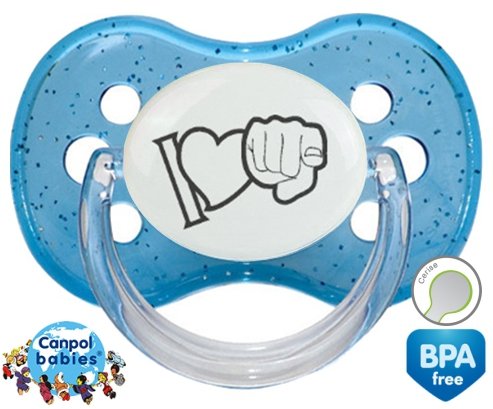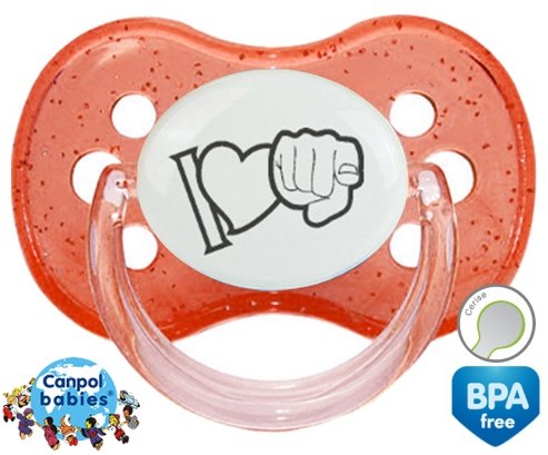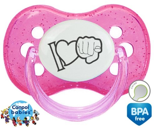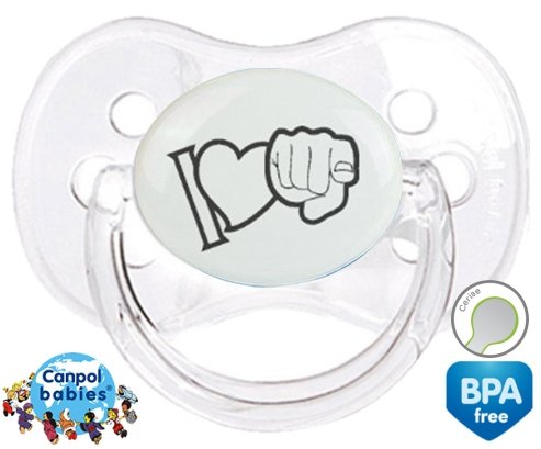Sucette personnalisée pour bébé I love toi à embout Cerise en silicone de la marque Canpol Babies avec impression en en Gris de la collection I love / I like.La silicone se reconnaît par sa couleur transparente. C'est une matière souple, douce, sans goût ni odeur et offre à bébé une succion plus facile grâce à sa souplesse.