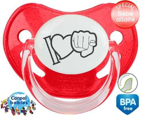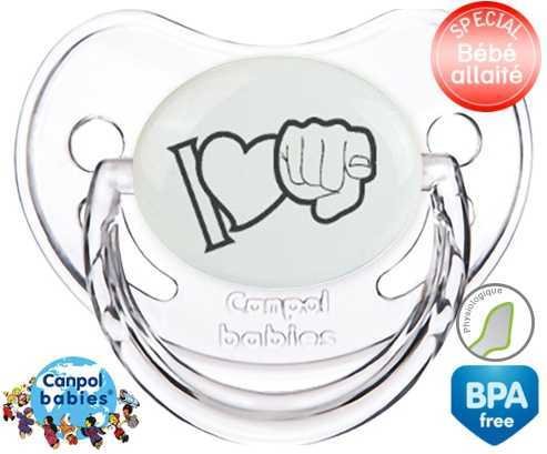 Sucette personnalisée pour bébé I love toi à embout Physiologique en silicone de la marque Canpol Babies avec impression en en Gris de la collection I love / I like.La silicone se reconnaît par sa couleur transparente. C'est une matière souple, douce, sans goût ni odeur et offre à bébé une succion plus facile grâce à sa souplesse.