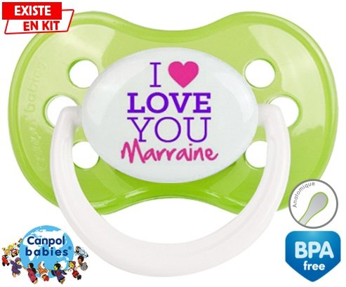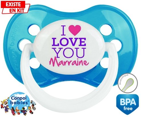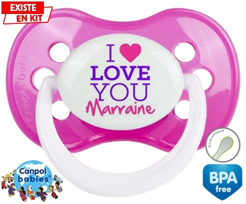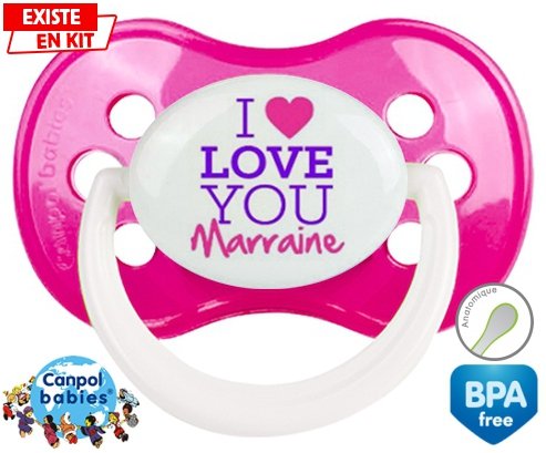 Tétine personnalisée pour bébé I love you marraine style2 à embout Anatomique en silicone de la marque Canpol Babies avec impression en en Couleurs de la collection I love / I like.La silicone se reconnaît par sa couleur transparente. C'est une matière souple, douce, sans goût ni odeur et offre à bébé une succion plus facile grâce à sa souplesse.