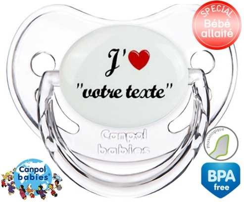 Tetine personnalisee pour bébé J'aime cœur + prénom à embout Physiologique en silicone de la marque Canpol Babies avec impression en en Couleurs de la collection Prénom personnalisé.La silicone se reconnaît par sa couleur transparente. C'est une matière souple, douce, sans goût ni odeur et offre à bébé une succion plus facile grâce à sa souplesse.