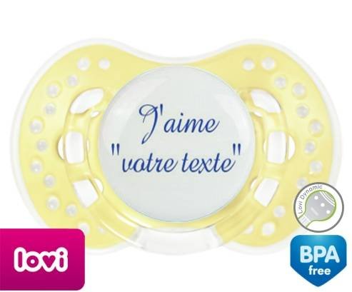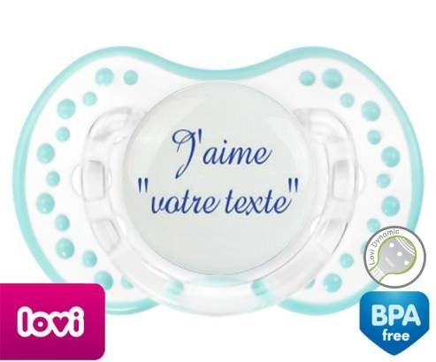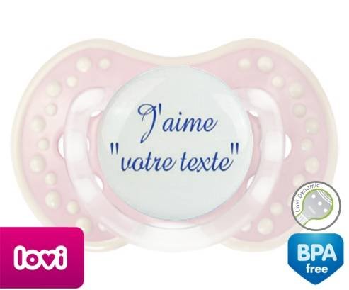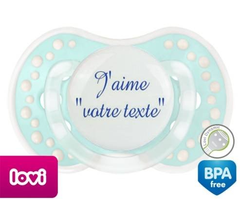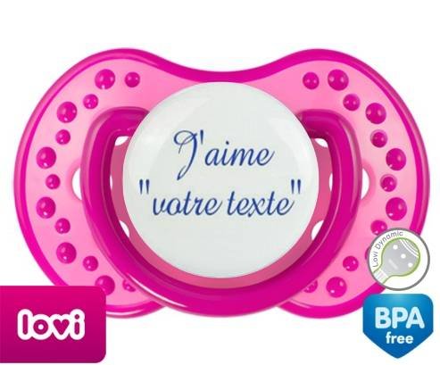 Tetine personnalisee avec le prénom pour bébé J'aime style3 + prénom : Embout LOVI Dynamic en silicone de la marque Lovi Dynamic avec impression en couleur.