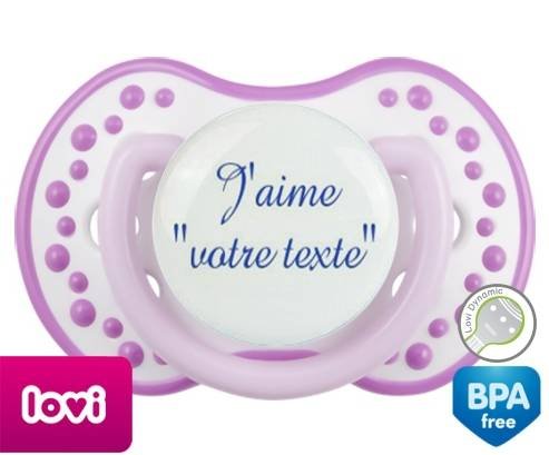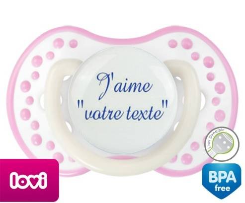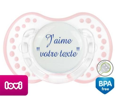 Tetine personnalisee pour bébé J'aime style3 + prénom à embout LOVI Dynamic en silicone de la marque Lovi Dynamic avec impression en en Couleurs de la collection Prénom personnalisé.La silicone se reconnaît par sa couleur transparente. C'est une matière souple, douce, sans goût ni odeur et offre à bébé une succion plus facile grâce à sa souplesse.