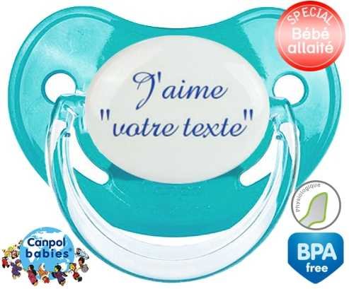 Sucette personnalisée avec le prénom pour bébé J'aime style3 + prénom : Sucette Physiologique en silicone de la marque Canpol Babies avec impression en couleur.
