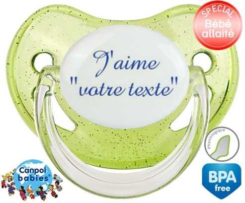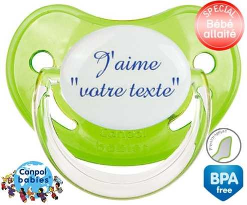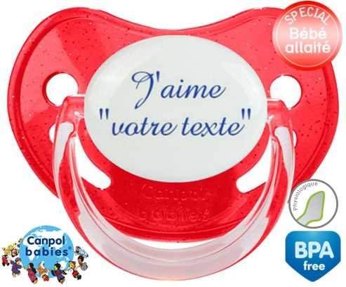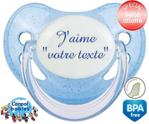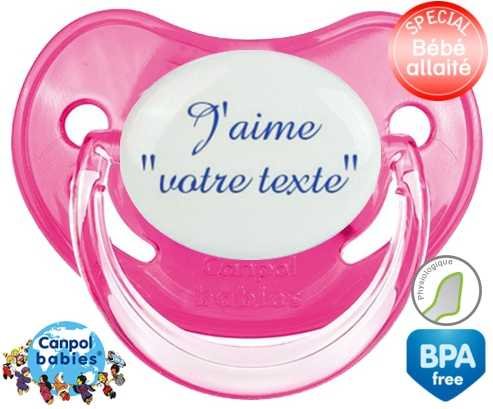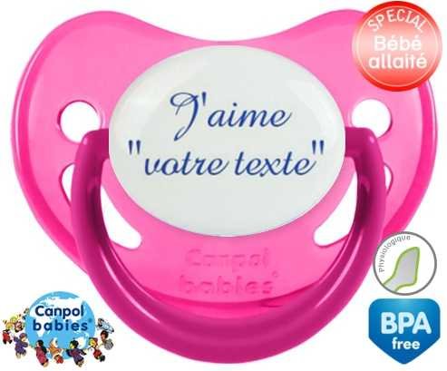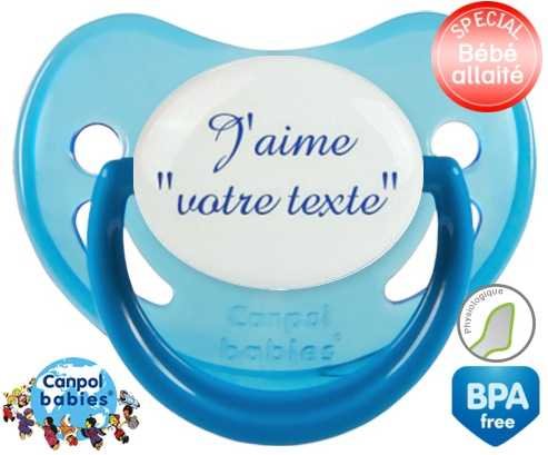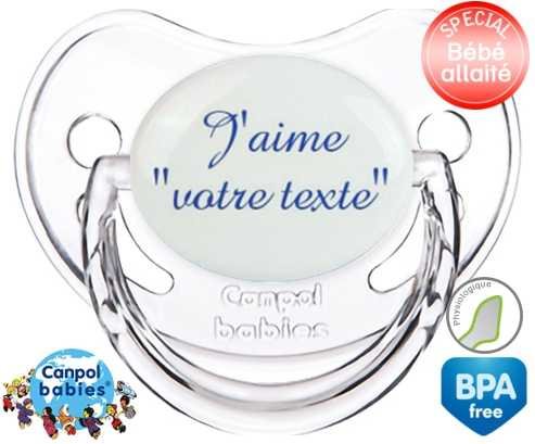 Sucette personnalisée pour bébé J'aime style3 + prénom à embout Physiologique en silicone de la marque Canpol Babies avec impression en en Couleurs de la collection Prénom personnalisé.La silicone se reconnaît par sa couleur transparente. C'est une matière souple, douce, sans goût ni odeur et offre à bébé une succion plus facile grâce à sa souplesse.