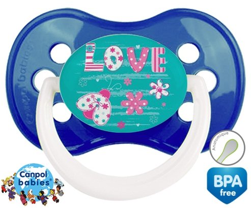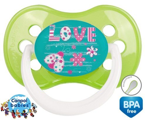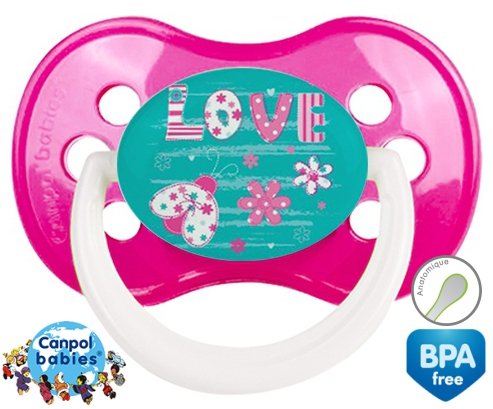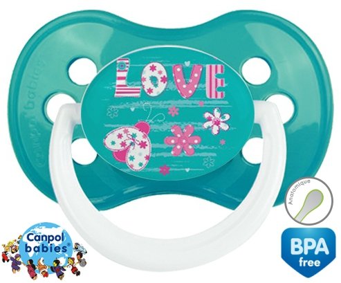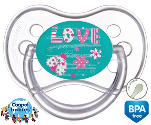 Tétine personnalisée pour bébé Love à embout Anatomique en silicone de la marque Canpol Babies avec impression en en Couleurs de la collection I love / I like.La silicone se reconnaît par sa couleur transparente. C'est une matière souple, douce, sans goût ni odeur et offre à bébé une succion plus facile grâce à sa souplesse.