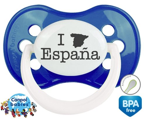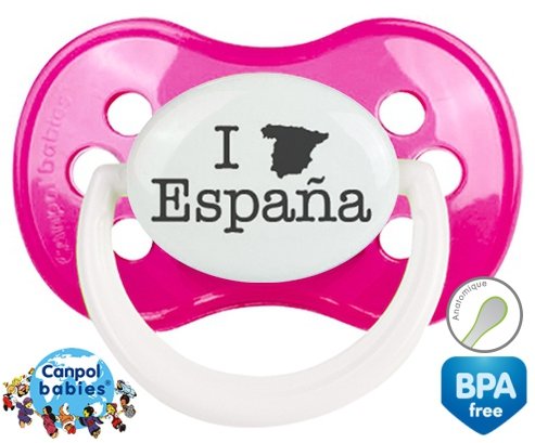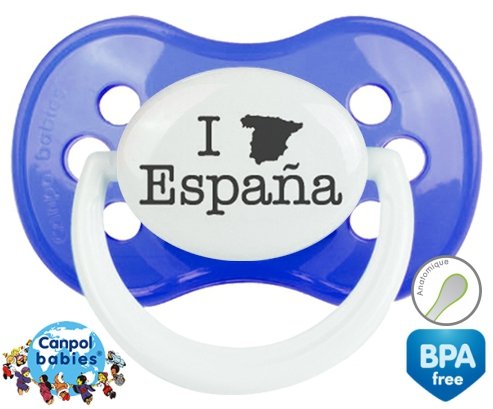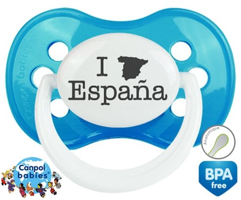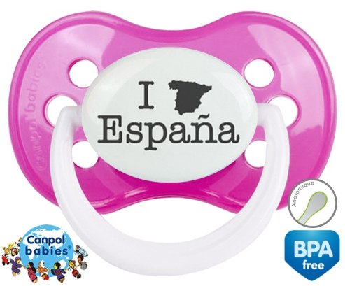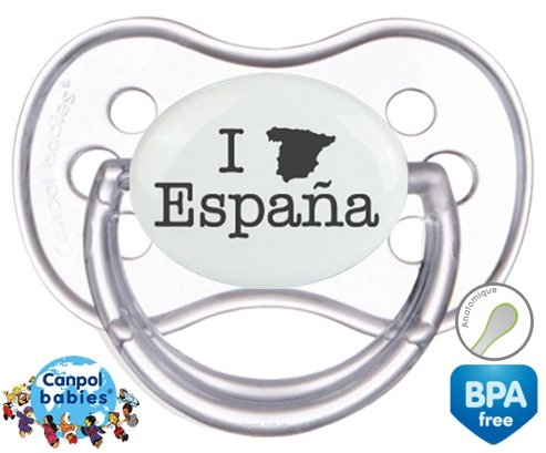 Sucette personnalisée pour bébé Originale i love espana à embout Anatomique en silicone de la marque Canpol Babies avec impression en en Gris de la collection I love / I like.La silicone se reconnaît par sa couleur transparente. C'est une matière souple, douce, sans goût ni odeur et offre à bébé une succion plus facile grâce à sa souplesse.
