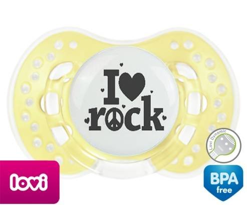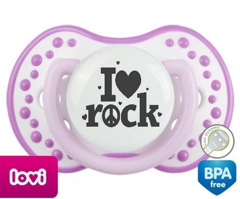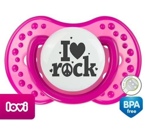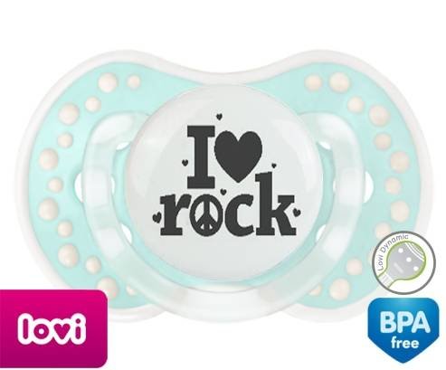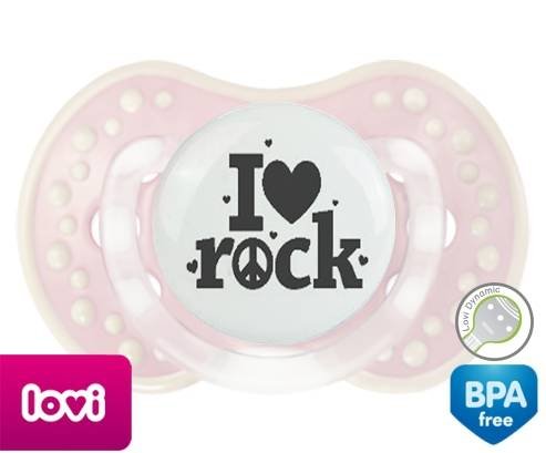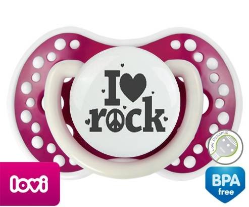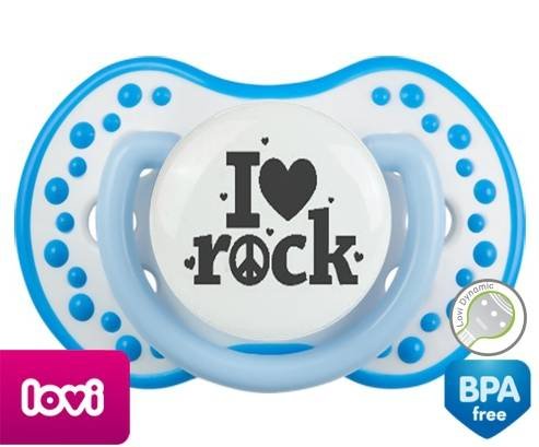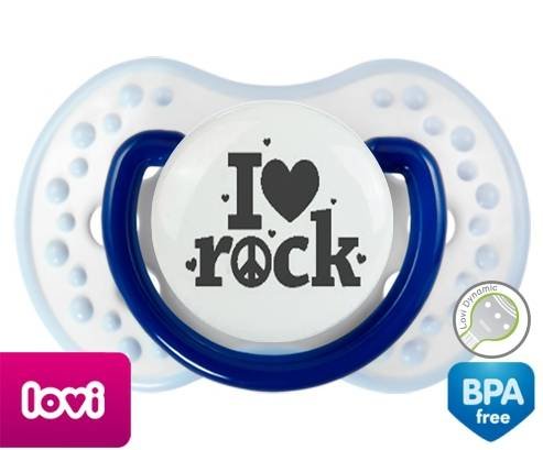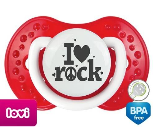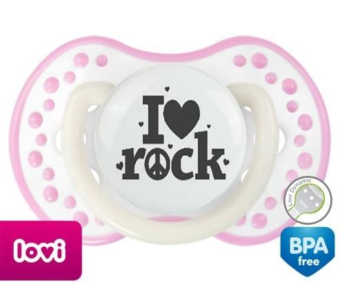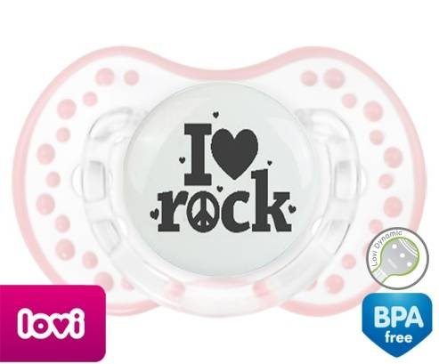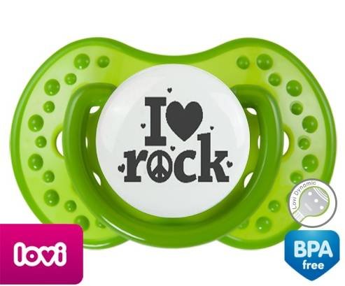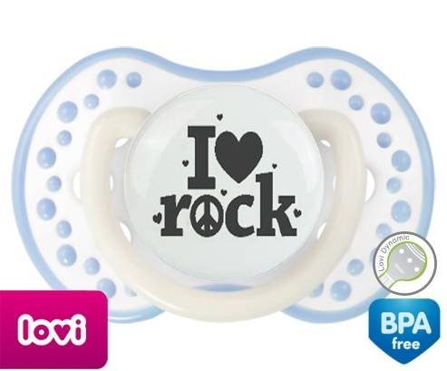 Sucette personnalisée pour bébé Originale i love rock à embout LOVI Dynamic en silicone de la marque Lovi Dynamic avec impression en en Gris de la collection I love / I like.La silicone se reconnaît par sa couleur transparente. C'est une matière souple, douce, sans goût ni odeur et offre à bébé une succion plus facile grâce à sa souplesse.