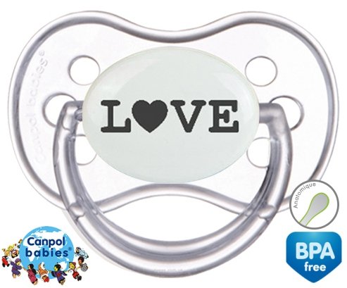 Tetine personnalisee pour bébé Originale love à embout Anatomique en silicone de la marque Canpol Babies avec impression en en Gris de la collection I love / I like.La silicone se reconnaît par sa couleur transparente. C'est une matière souple, douce, sans goût ni odeur et offre à bébé une succion plus facile grâce à sa souplesse.
