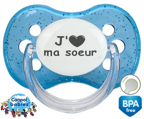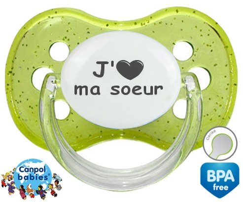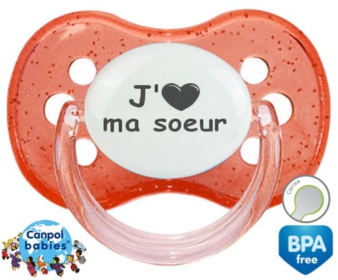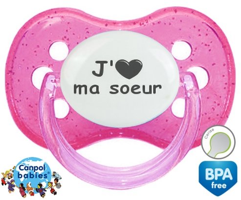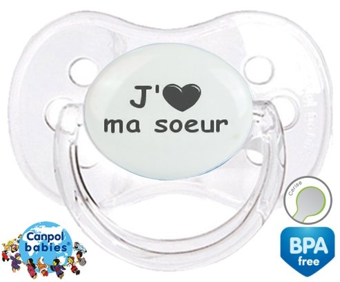 Sucette personnalisée pour bébé Coeur j'aime ma soeur à embout Cerise en silicone de la marque Canpol Babies avec impression en en Gris de la collection j'aime / j'adore.La silicone se reconnaît par sa couleur transparente. C'est une matière souple, douce, sans goût ni odeur et offre à bébé une succion plus facile grâce à sa souplesse.