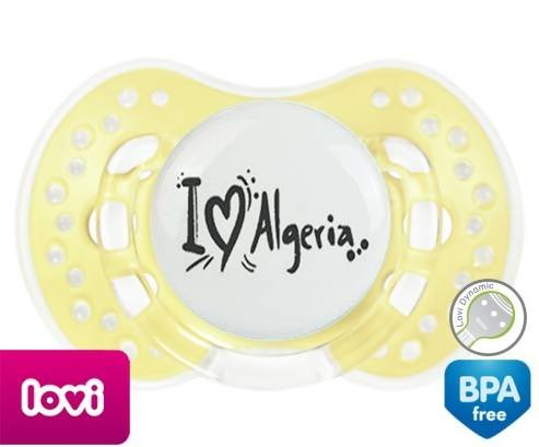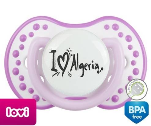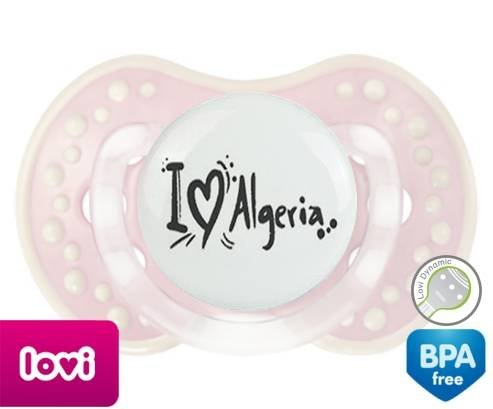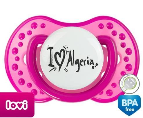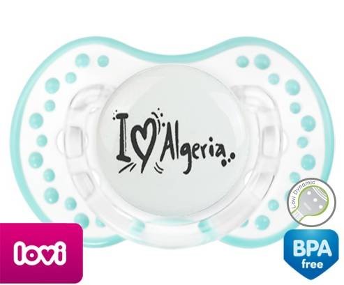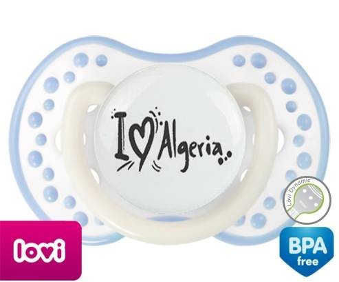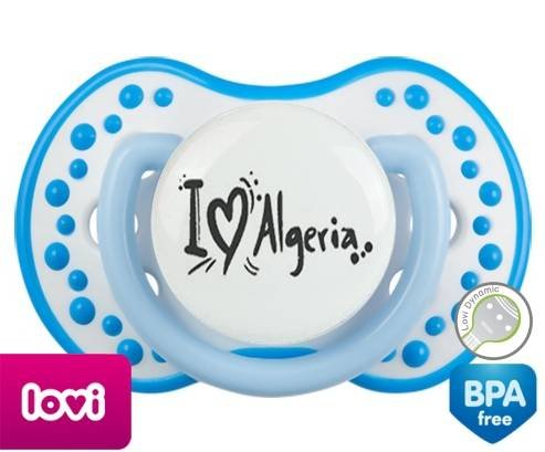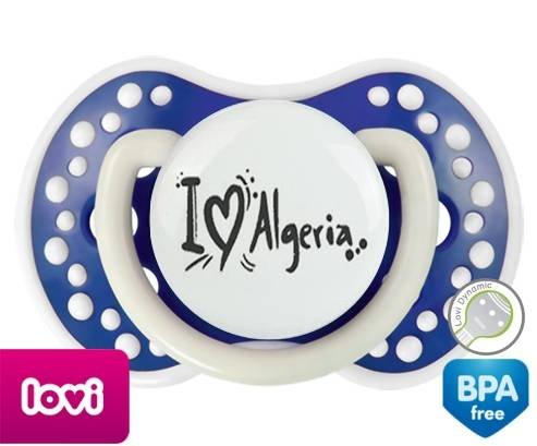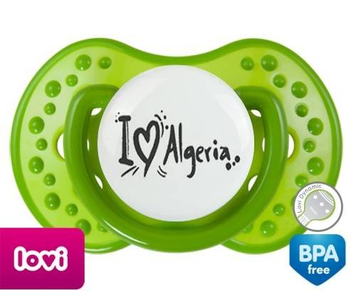 Sucette personnalisée pour bébé J'aime algerie à embout LOVI Dynamic en silicone de la marque Lovi Dynamic avec impression en en Gris de la collection j'aime / j'adore.La silicone se reconnaît par sa couleur transparente. C'est une matière souple, douce, sans goût ni odeur et offre à bébé une succion plus facile grâce à sa souplesse.