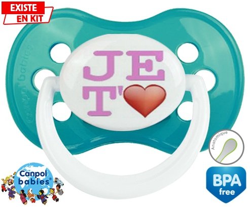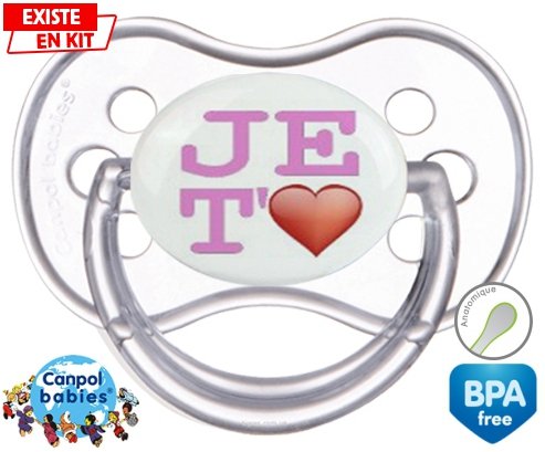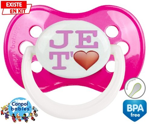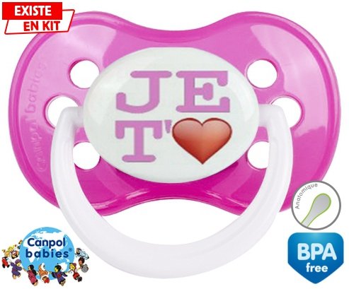 Sucette personnalisée pour bébé Je t'aime modèle fille à embout Anatomique en silicone de la marque Canpol Babies avec impression en en Couleurs de la collection j'aime / j'adore.La silicone se reconnaît par sa couleur transparente. C'est une matière souple, douce, sans goût ni odeur et offre à bébé une succion plus facile grâce à sa souplesse.