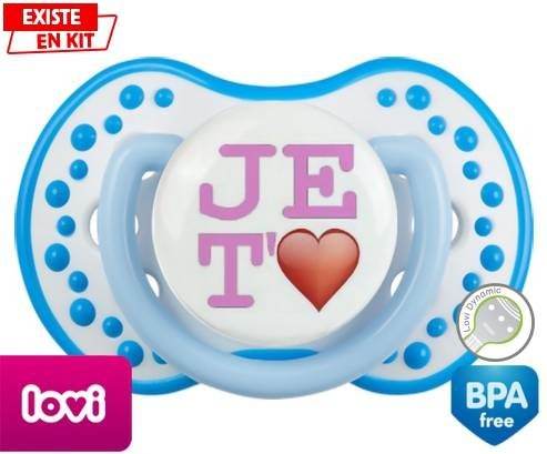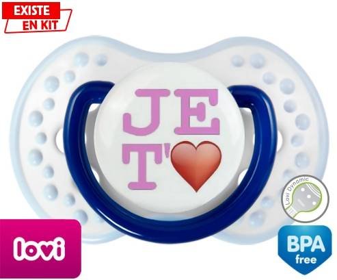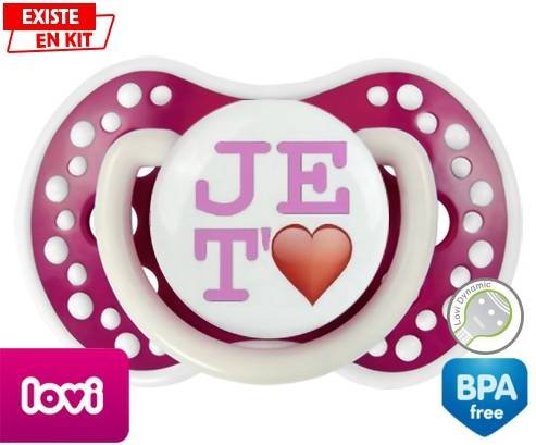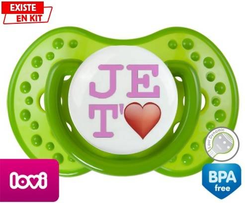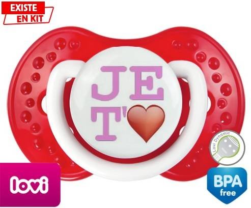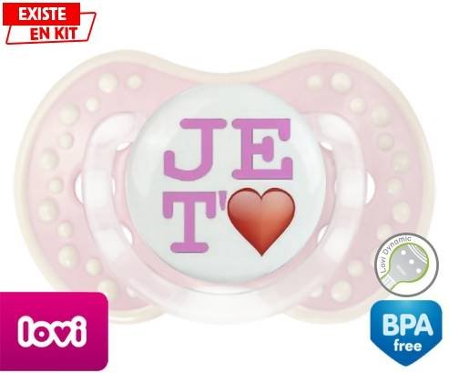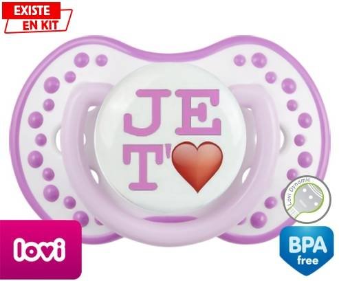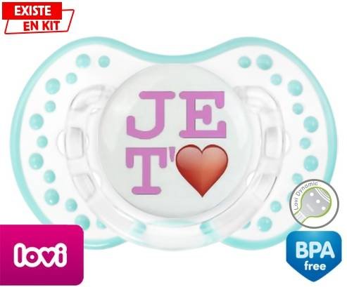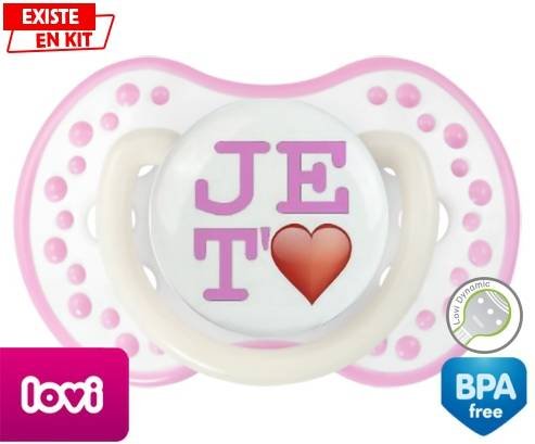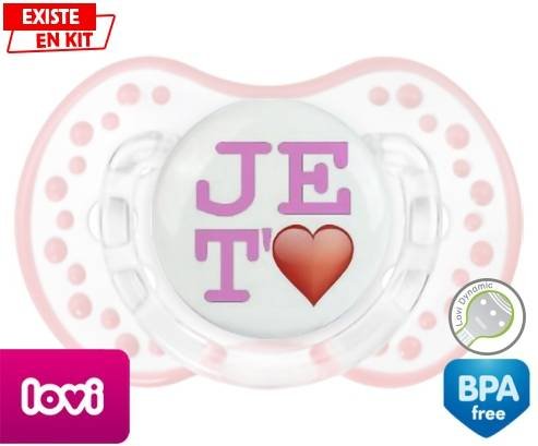 Tétine personnalisée pour bébé Je t'aime modèle fille à embout LOVI Dynamic en silicone de la marque Lovi Dynamic avec impression en en Couleurs de la collection j'aime / j'adore.La silicone se reconnaît par sa couleur transparente. C'est une matière souple, douce, sans goût ni odeur et offre à bébé une succion plus facile grâce à sa souplesse.