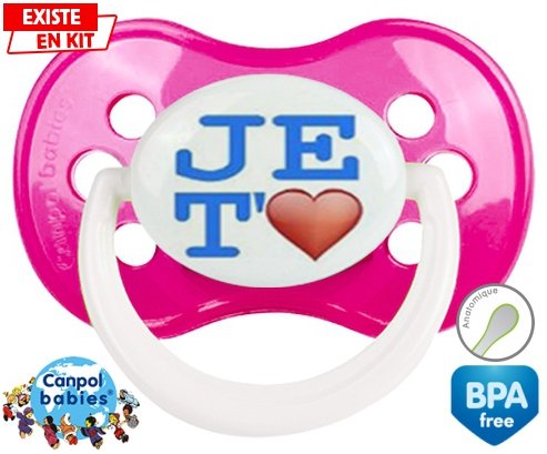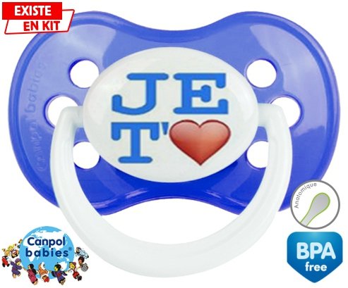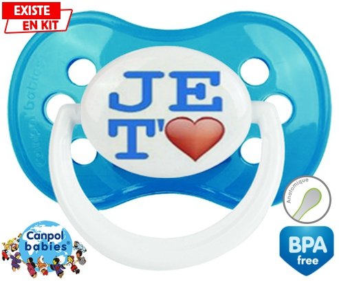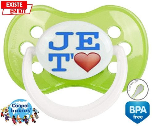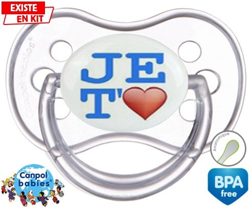 Tétine personnalisée pour bébé Je t'aime modèle garçon à embout Anatomique en silicone de la marque Canpol Babies avec impression en en Couleurs de la collection j'aime / j'adore.La silicone se reconnaît par sa couleur transparente. C'est une matière souple, douce, sans goût ni odeur et offre à bébé une succion plus facile grâce à sa souplesse.