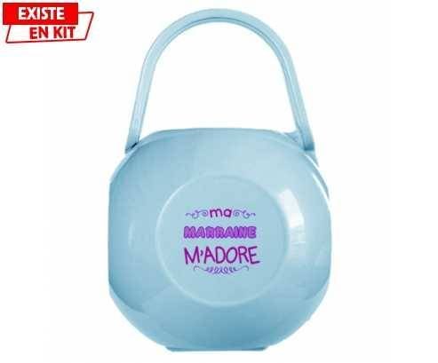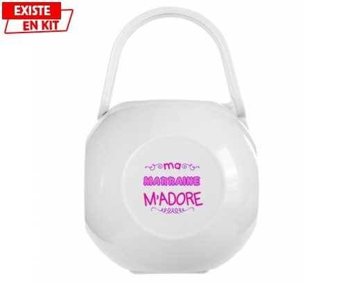 Boîte à sucette avec design : Ma marraine m'adore (fille) , impression de qualité et en couleur. Pratique : elle transporte la sucette en tout lieu. Grâce à sa poignée souple, elle est facile à accrocher à la poussette, sac à langer ... Cette boîte de rangement flexible, est la solution hygiénique pour protéger les sucettes de son enfant quand il ne les utilise pas. Peut contenir jusqu'à deux sucettes.