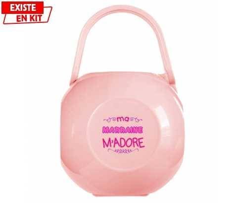 Boîte à sucette personnalisée : Ma marraine m'adore (fille) , avec une impression en couleur et qui compléte toute la gamme ( sucette, attache-sucette, bavoir, chausson, body et bonnet).