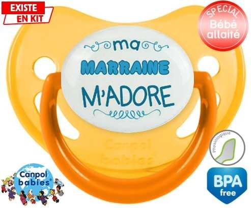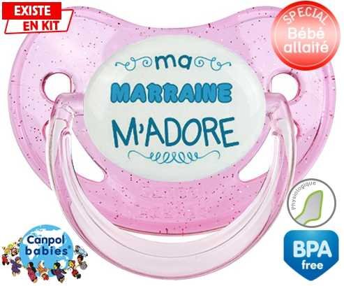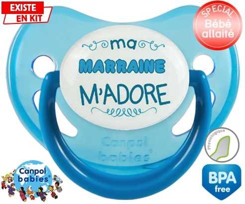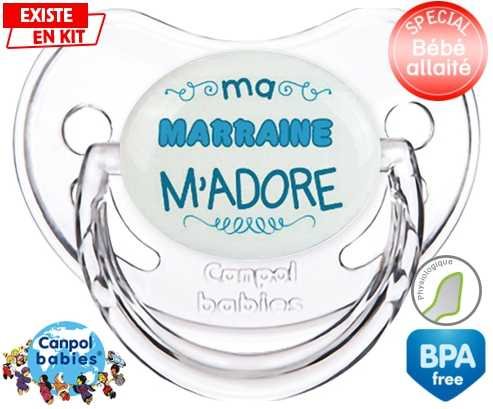 Tétine personnalisée pour bébé Ma marraine m'adore (garcon) à embout Physiologique en silicone de la marque Canpol Babies avec impression en en Couleurs de la collection j'aime / j'adore.La silicone se reconnaît par sa couleur transparente. C'est une matière souple, douce, sans goût ni odeur et offre à bébé une succion plus facile grâce à sa souplesse.