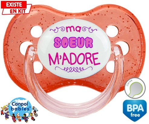 Sucette personnalisée pour bébé Ma soeur m'adore (fille) à embout Cerise en silicone de la marque Canpol Babies avec impression en en Couleurs de la collection j'aime / j'adore.La silicone se reconnaît par sa couleur transparente. C'est une matière souple, douce, sans goût ni odeur et offre à bébé une succion plus facile grâce à sa souplesse.