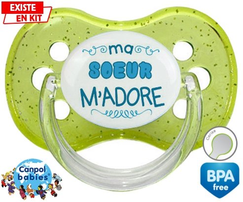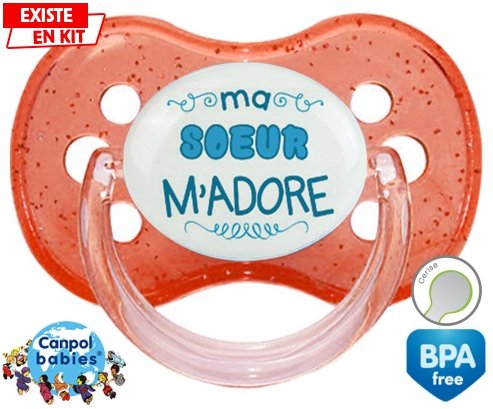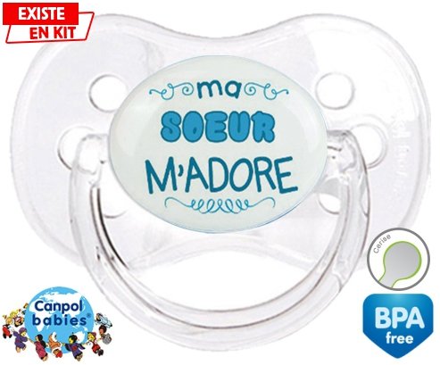 Sucette personnalisée pour bébé Ma soeur m'adore (garcon) à embout Cerise en silicone de la marque Canpol Babies avec impression en en Couleurs de la collection j'aime / j'adore.La silicone se reconnaît par sa couleur transparente. C'est une matière souple, douce, sans goût ni odeur et offre à bébé une succion plus facile grâce à sa souplesse.