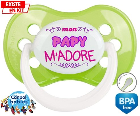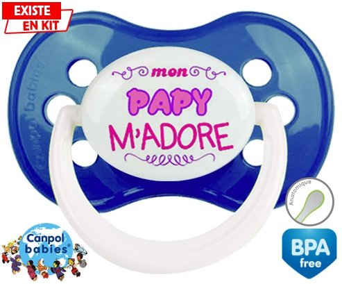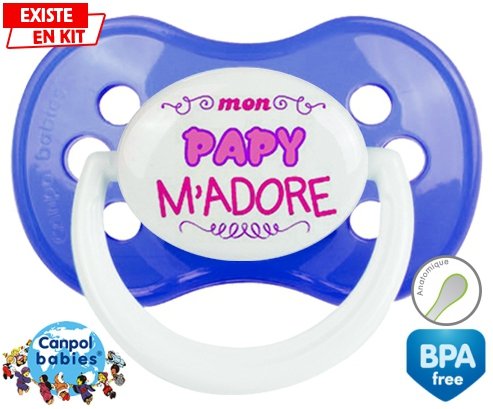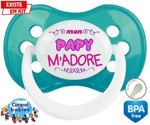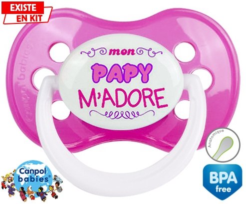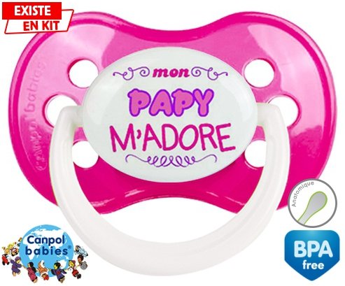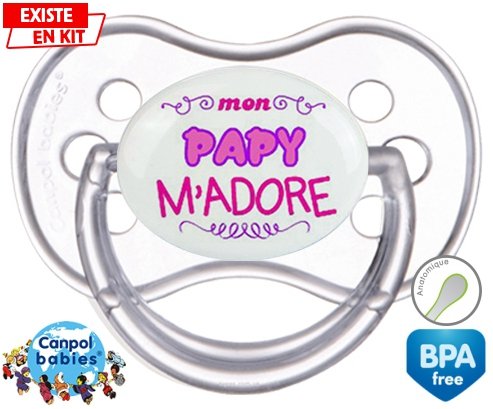 Sucette personnalisée pour bébé Mon papy m'adore (fille) à embout Anatomique en silicone de la marque Canpol Babies avec impression en en Couleurs de la collection j'aime / j'adore.La silicone se reconnaît par sa couleur transparente. C'est une matière souple, douce, sans goût ni odeur et offre à bébé une succion plus facile grâce à sa souplesse.