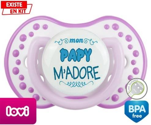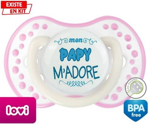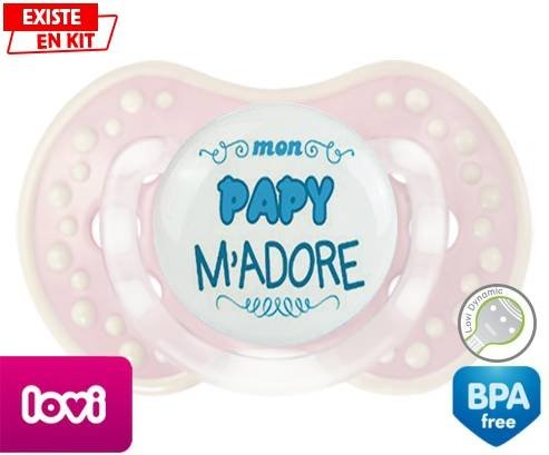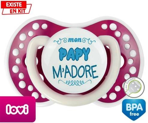 Sucette personnalisée pour bébé Mon papy m'adore (garcon) à embout LOVI Dynamic en silicone de la marque Lovi Dynamic avec impression en en Couleurs de la collection j'aime / j'adore.La silicone se reconnaît par sa couleur transparente. C'est une matière souple, douce, sans goût ni odeur et offre à bébé une succion plus facile grâce à sa souplesse.