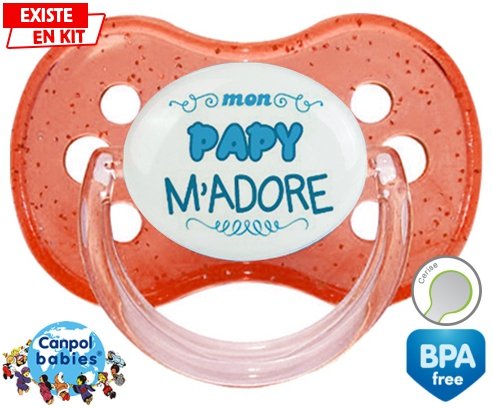 Tétine personnalisée pour bébé Mon papy m'adore (garcon) à embout Cerise en silicone de la marque Canpol Babies avec impression en en Couleurs de la collection j'aime / j'adore.La silicone se reconnaît par sa couleur transparente. C'est une matière souple, douce, sans goût ni odeur et offre à bébé une succion plus facile grâce à sa souplesse.