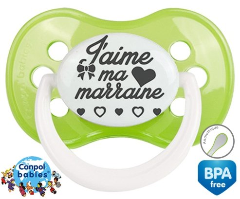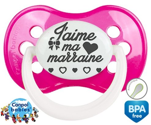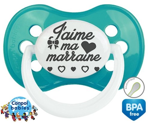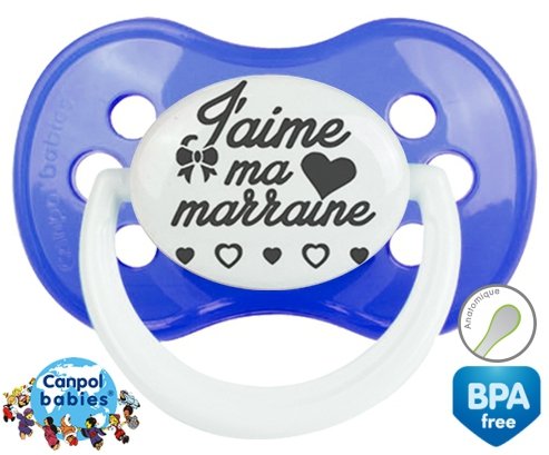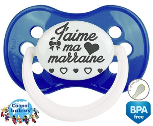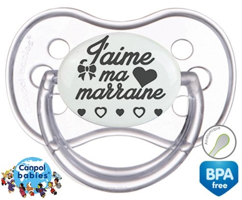 Sucette personnalisée pour bébé Originale j'aime ma marraine à embout Anatomique en silicone de la marque Canpol Babies avec impression en en Gris de la collection j'aime / j'adore.La silicone se reconnaît par sa couleur transparente. C'est une matière souple, douce, sans goût ni odeur et offre à bébé une succion plus facile grâce à sa souplesse.