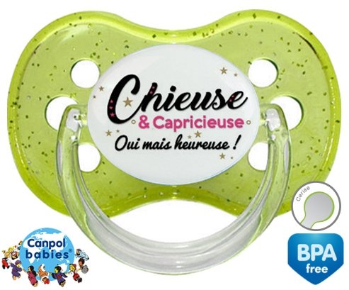 Sucette personnalisée pour bébé Chieuse et capricieuse mais heureuse! à embout Cerise en silicone de la marque Canpol Babies avec impression en en Couleurs de la collection Message.La silicone se reconnaît par sa couleur transparente. C'est une matière souple, douce, sans goût ni odeur et offre à bébé une succion plus facile grâce à sa souplesse.