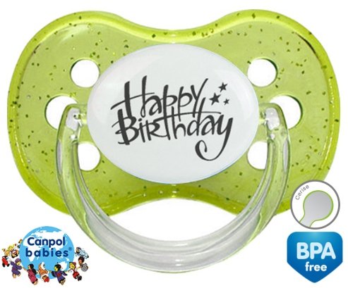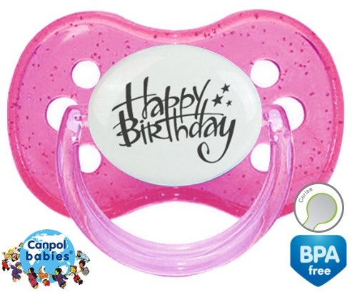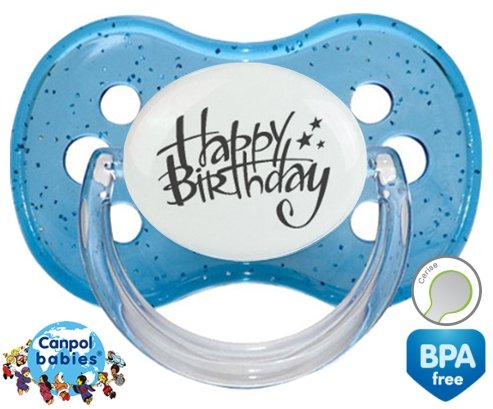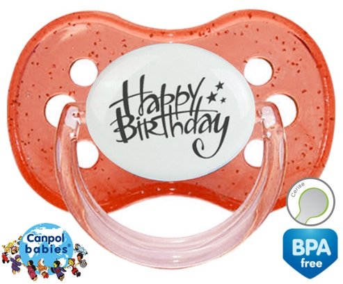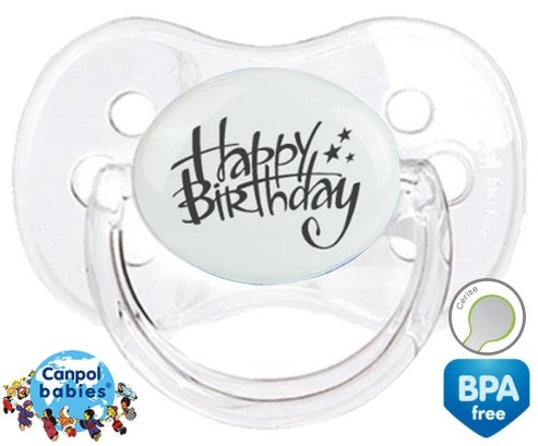Sucette personnalisée pour bébé Happy birthday style1 à embout Cerise en silicone de la marque Canpol Babies avec impression en en Gris de la collection Message.La silicone se reconnaît par sa couleur transparente. C'est une matière souple, douce, sans goût ni odeur et offre à bébé une succion plus facile grâce à sa souplesse.