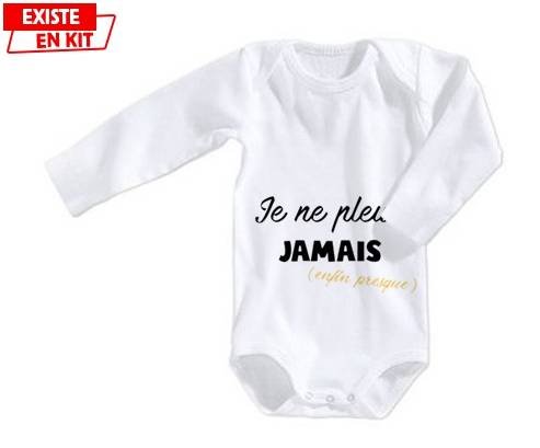 Body personnalisé Je ne pleure jamais (enfin presque) avec impression en couleur, en coton à encolure américaine croisée et manches courtes ou longues. Ils se ferment par boutons pression dans l’entrejambe pour faciliter le change. Les bodies constituent l’essentiel du premier dressing de bébé, surtout personnalisés. Faites le plein de confort et de douceur pour votre bébé en craquant pour ce magnifique body à manches longues ou courtes !, 100% coton.