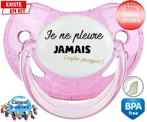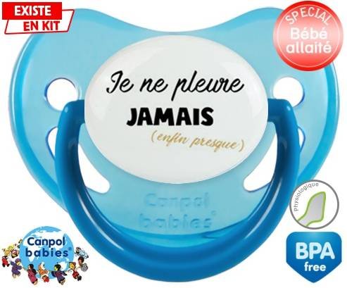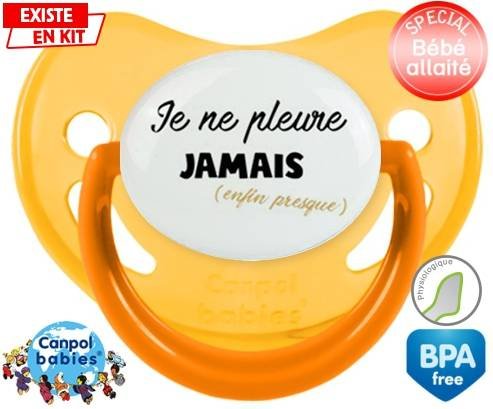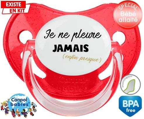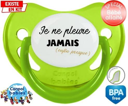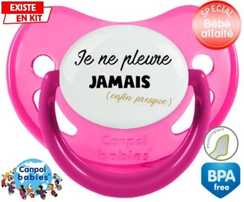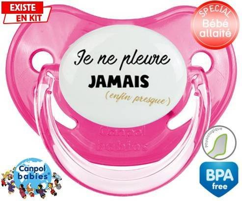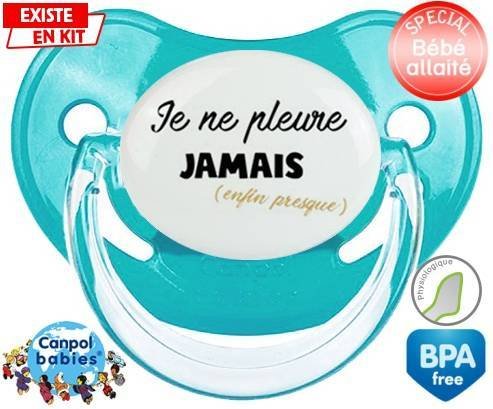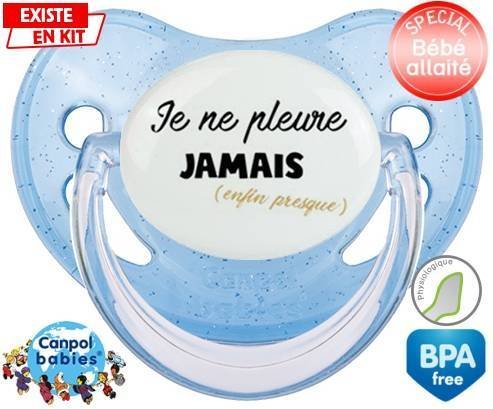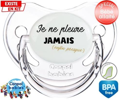 Tétine personnalisée pour bébé Je ne pleure jamais (enfin presque) à embout Physiologique en silicone de la marque Canpol Babies avec impression en en Couleurs de la collection Message.La silicone se reconnaît par sa couleur transparente. C'est une matière souple, douce, sans goût ni odeur et offre à bébé une succion plus facile grâce à sa souplesse.