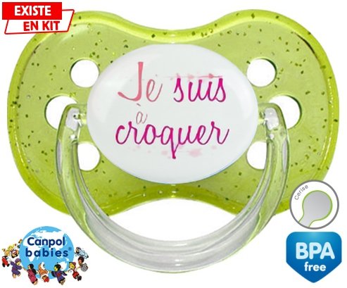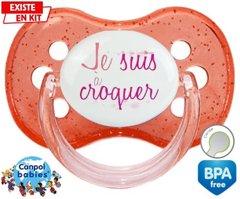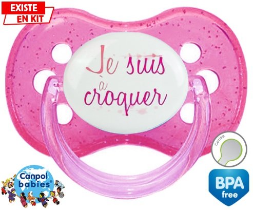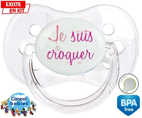 Sucette personnalisée pour bébé Je suis à croquer modèle fille à embout Cerise en silicone de la marque Canpol Babies avec impression en en Couleurs de la collection Message.La silicone se reconnaît par sa couleur transparente. C'est une matière souple, douce, sans goût ni odeur et offre à bébé une succion plus facile grâce à sa souplesse.