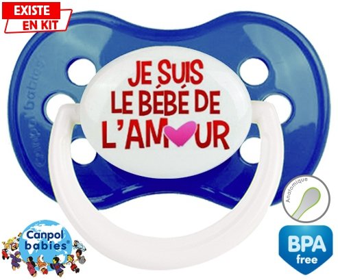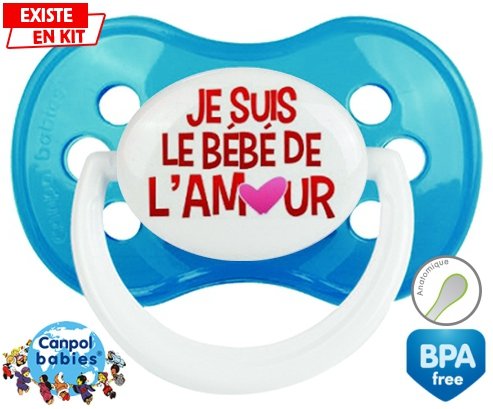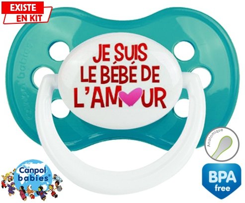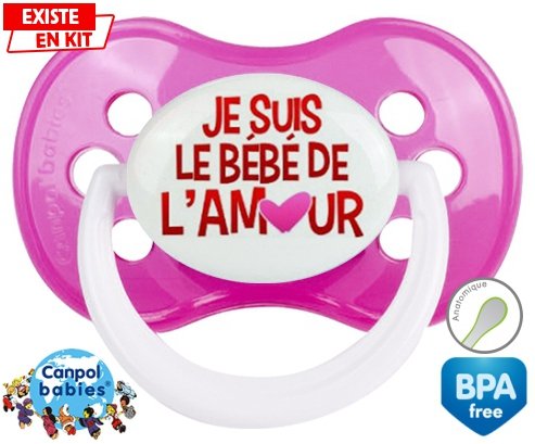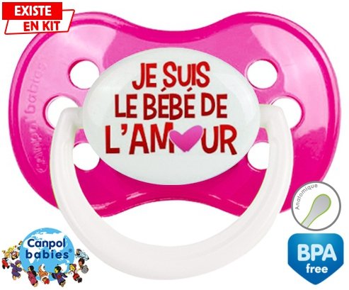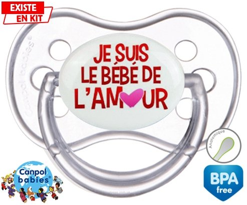 Sucette personnalisée pour bébé Je suis le bébé de l'amour à embout Anatomique en silicone de la marque Canpol Babies avec impression en en Couleurs de la collection Message.La silicone se reconnaît par sa couleur transparente. C'est une matière souple, douce, sans goût ni odeur et offre à bébé une succion plus facile grâce à sa souplesse.