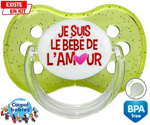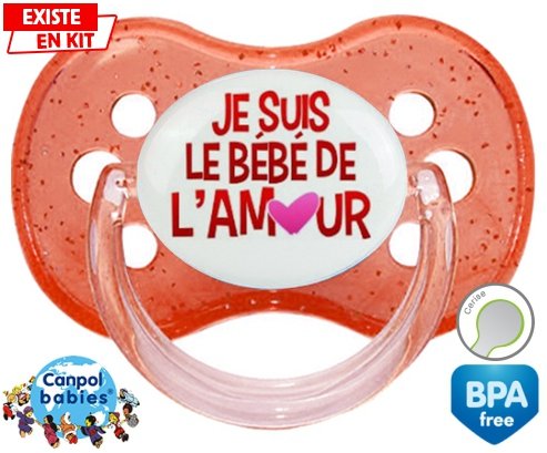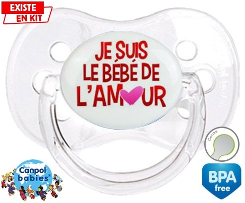 Tétine personnalisée pour bébé Je suis le bébé de l'amour à embout Cerise en silicone de la marque Canpol Babies avec impression en en Couleurs de la collection Message.La silicone se reconnaît par sa couleur transparente. C'est une matière souple, douce, sans goût ni odeur et offre à bébé une succion plus facile grâce à sa souplesse.