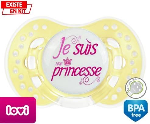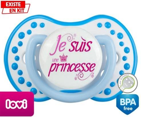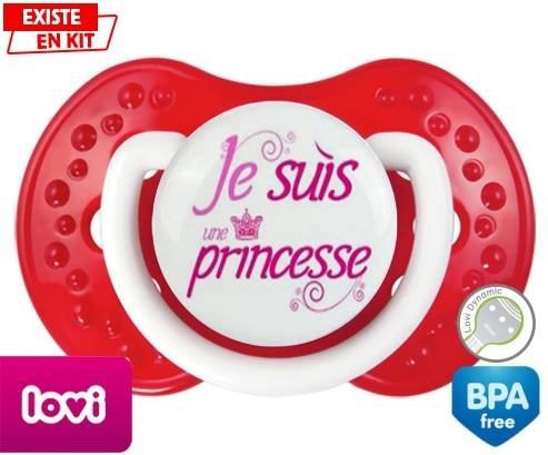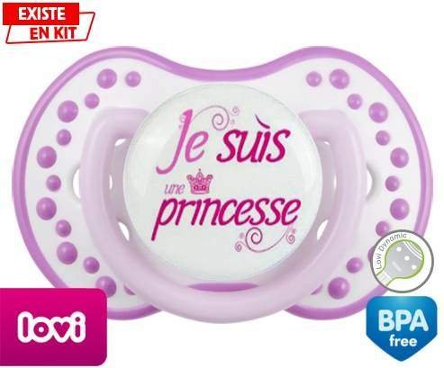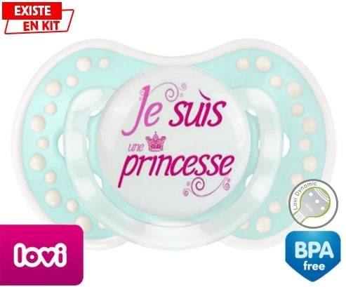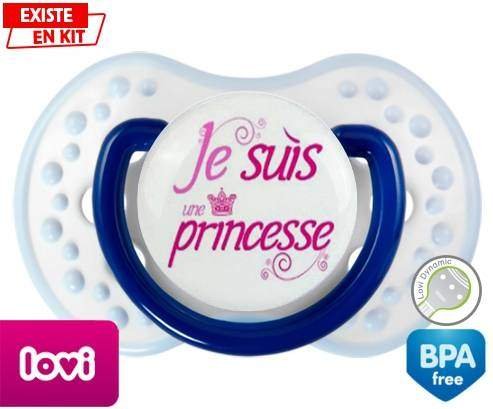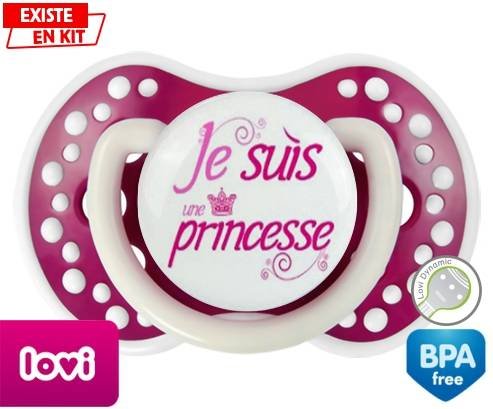 Sucette personnalisée pour bébé Je suis une princesse à embout LOVI Dynamic en silicone de la marque Lovi Dynamic avec impression en en Couleurs de la collection Message.La silicone se reconnaît par sa couleur transparente. C'est une matière souple, douce, sans goût ni odeur et offre à bébé une succion plus facile grâce à sa souplesse.